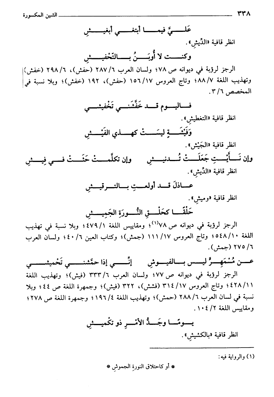 الرجز لرؤبة في ديوانه ص 77؛ ولسان العرب 6/ 333 (فيش)؛ وتهذيب اللغة 11/ 428؛ وتاج العروس 17/ 314 (فشش)، 322 (فيش)؛ وجمهرة اللغة ص 44؛ وبلا نسبة في لسان العرب 6/ 288 (حمش)؛ وتهذيب اللغة 4/ 196؛ وجمهرة اللغة ص 278؛ ومقاييس اللغة 2/ 104.