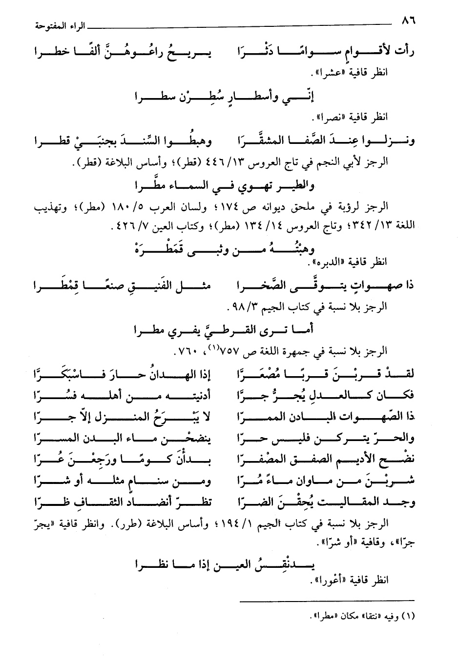 الرجز بلا نسبة في كتاب الجيم 1/ 194؛ وأساس البلاغة (طرر). وانظر قافية «يجر جرا»، وقافية «أو شرا».