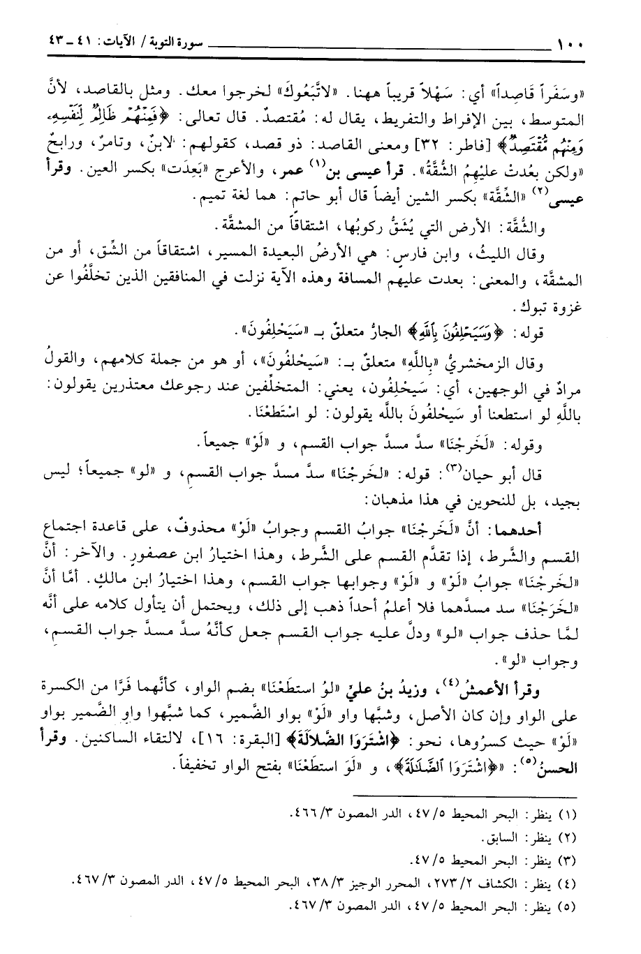 {وَسَفَراً قَاصِداً} أي: سَهْلاً قريباً ههنا. {لاَّتَّبَعُوكَ} لخرجوا معك. ومثل بالقاصد، لأنَّ المتوسط، بين الإفراد والتفريط، يقال له: مُقتصدٌ. قال تعالى: {فَمِنْهُمْ ظَالِمٌ لِّنَفْسِهِ وَمِنْهُمْ مُّقْتَصِدٌ} [فاطر: 32] ومعنى القاصد: ذو قصد، كقولهم: لابنٌ، وتامرٌ، ورابحٌ {ولكن بَعُدَتْ عَلَيْهِمُ الشقة} . قرأ عيسى بن عمر، والأعرج «بَعِدَت» بكسر العين. وقرأ عيسى «الشِّقَّة» بكسر الشين أيضاً قال أبو حاتمٍ: هما لغة تميم.