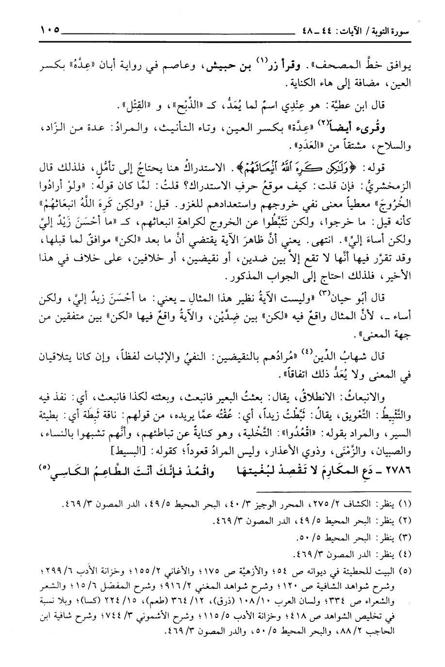 قوله: {ولكن كَرِهَ الله انبعاثهم} . الاستدراكُ هنا يحتاجُ إلى تأمُّلٍ، فلذلك قال الزمخشريُّ: فإن قلت: كيف موقعُ حرفِ الاستدراك؟ قلتُ: لمَّا كان قوله: {وَلَوْ أَرَادُواْ الخروج} معطياً معنى نفي خروجهم واستعدادهم للغزو. قيل: {ولكن كَرِهَ الله انبعاثهم} كأنه قيل: ما خرجوا، ولكن تَثَبَّطُوا عن الخروج لكراهةِ انبعاثهم،: «ما أحْسَنَ زَيْدٌ إليَّ ولكن أساءَ إليَّ» . انتهى. يعني أنَّ ظاهرَ الآية يقتضي أنَّ ما بعد «لكن» موافقٌ لما قبلها، وقد تقرَّر فيها أنَّها لا تقع إلاَّ بين ضدين، أو نقيضين، أو خلافين، على خلاف في هذا الأخير، فلذلك احتاج إلى الجواب المذكور.