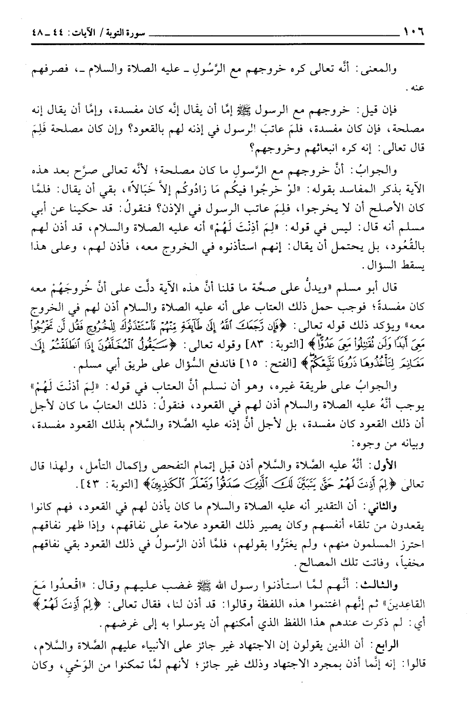 قال أبو مسلم «ويدلُّ على صحَّة ما قلنا أنَّ هذه الآية دلَّت على أنَّ خُروجَهُمْ معه كان مفسدةً؛ فوجب حمل ذلك العتاب على أنه عَلَيْهِ الصَّلَاة وَالسَّلَام ُ أذن لهم في الخروج معه» ويؤكد ذلك قوله تعالى: