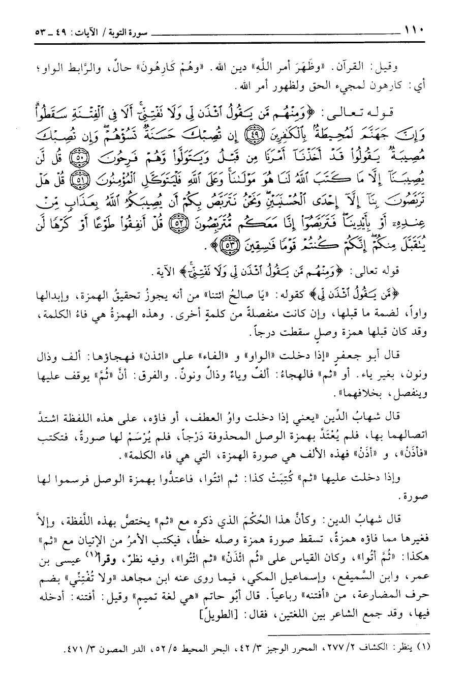 قال شهابُ الدين: وكأنَّ هذا الحُكْمَ الذي ذكره مع «ثم» يختصُّ بهذه اللَّفظة، وإلاَّ فغيرها مما فاؤه همزةٌ، تسقط صورة همزة وصله خطّاً، فيكتب الأمرُ من الإتيان مع «ثم» هكذا: «ثُمَّ أتُوا» ، وكان القياس على «ثُم ائْذَانْ» «ثم ائْتُوا» ، وفيه نظرٌ، وقرأ عيسى بن عمر، وابن السَّميفع، وإسماعيل المكي، فيما روى عنه ابن مجاهد «ولا تُفْتِنِّي» بضم حرف المضارعة، من «أفتنه» رباعياً. قال أبُو حاتم «هي لغة تميمٍ» وقيل: أفتنه: أدخله فيها، وقد جمع الشاعر بين اللغتين، فقال: [الطويل]