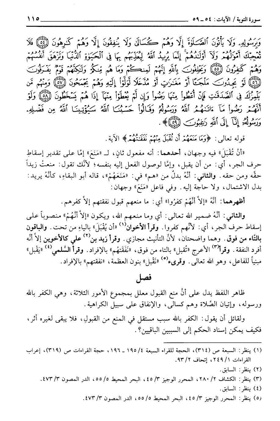 «أنْ تُقْبَلَ» فيه وجهان، أحدهما: أنه مفعول ثانٍ، ل «مَنَعَ» إمَّا على تقدير إسقاطِ حرف الجر، أي: من أن يقبل، وإمَّا لوصول الفعل إليه بنفسه؛ لأنَّك تقول: منعتُ زيداً حقَّه ومن حقه. والثاني: أنَّهُ بدلٌ من «هم» في: «مَنَعَهُمْ» ، قاله أبو البقاءِ، كأنَّهُ يريد: بدل الاشتمال، ولا حاجة إليه. وفي فاعل «مَنَعَ» وجهان: