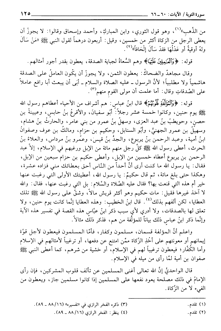 واعلم أنَّ المؤلفة قسمان، مسلمون وكفار، فأمَّا المسلمون فيعطون لأجل قوَّة إيمانهم أو معونتهم على أخْذِ الزَّكاة ممَّن امتنع عن دفعها، أو ترغيباً لأمثالهم في الإسلام وأما الكُفَّار؛ فيعطون ترغيباً لهم في الإسلام، أو خشية من شرهم، كما أعطى النبي صَلَّى اللَّهُ عَلَيْهِ وَسَلَّم َ صفوان بن أمية لمَّا رأى من ميله في الإسلام.