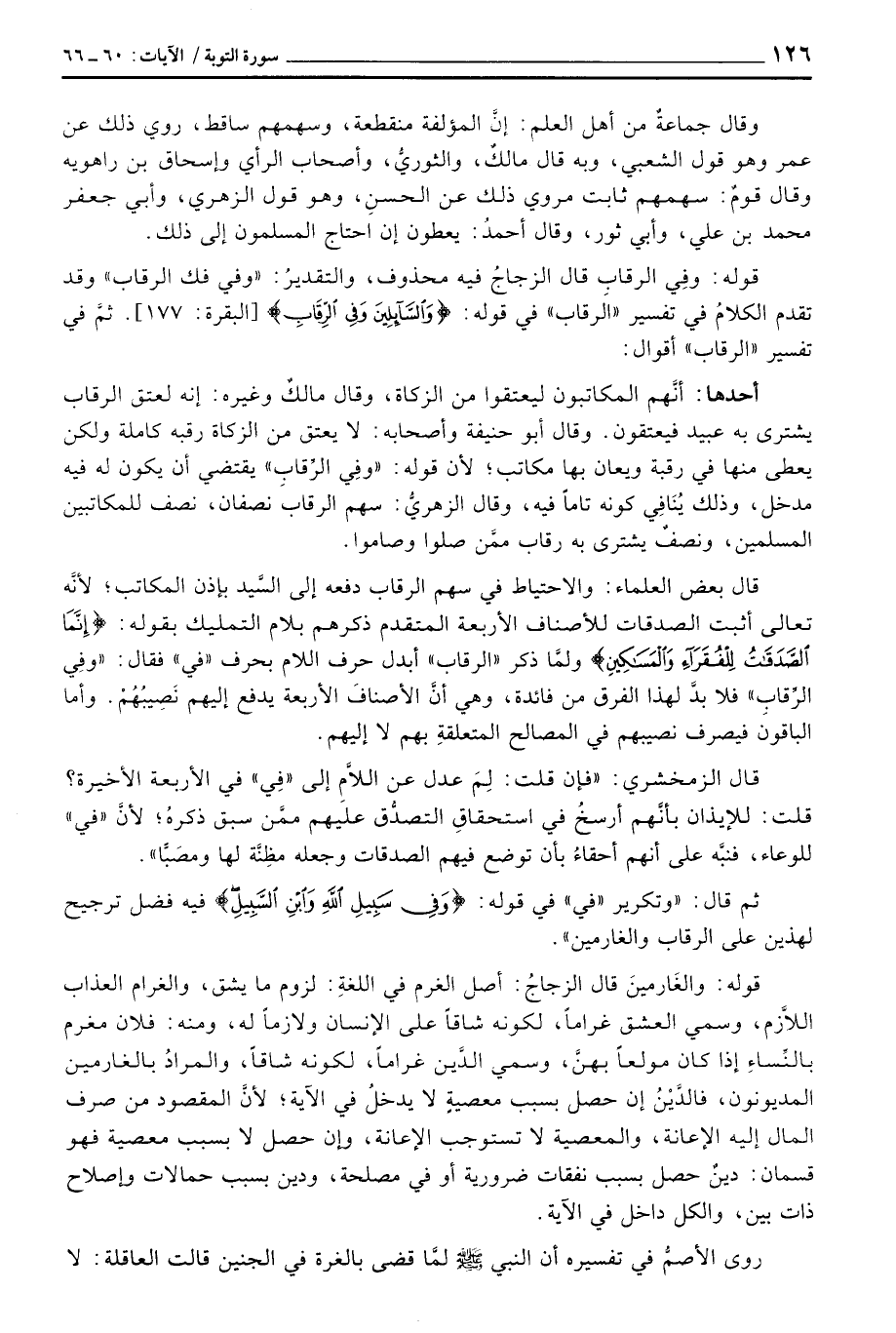 قوله: وفِي الرقابِ قال الزجاجُ فيه محذوف، والتقديرُ: «وفي فك الرقاب» وقد تقدم الكلامُ في تفسير «الرقاب» في قوله: {والسآئلين وَفِي الرقاب} [البقرة: 177] . ثمَّ في تفسير «الرقاب» أقوال: