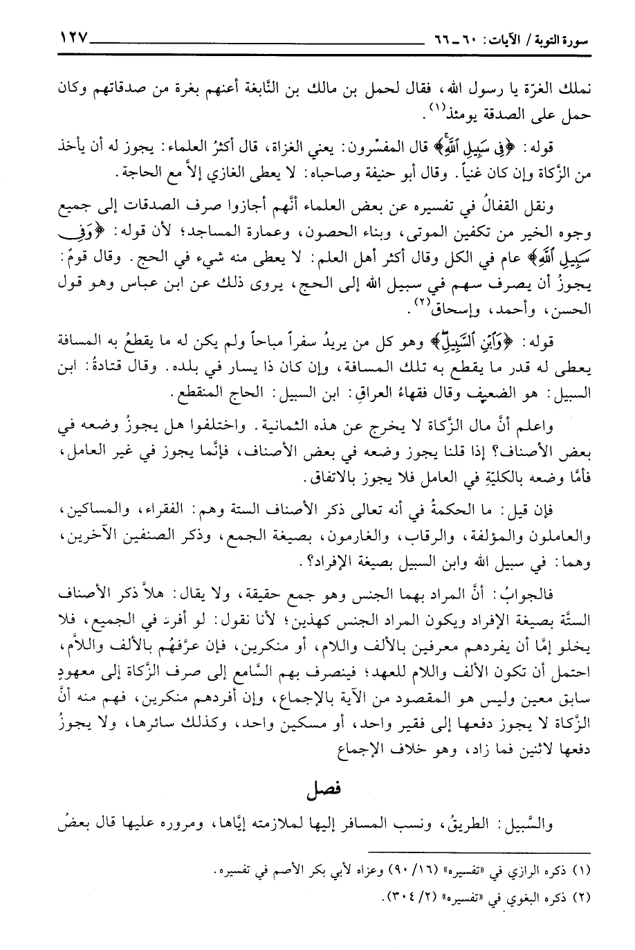 فإن قيل: ما الحكمةُ في أنه تعالى ذكر الأصناف الستة وهم: الفقراء، والمساكين، والعاملون والمؤلفة، والرقاب، والغارمون، بصيغة الجمع، وذكر الصنفين الآخرين، وهما: في سبيل الله وابن السبيل بصيغة الإفراد؟