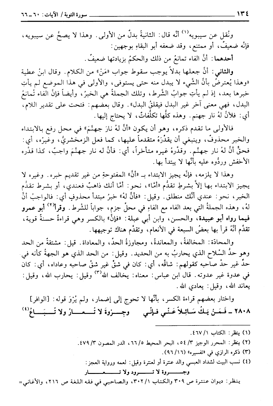 وهذا لا يلزمه، فإنَّه يجيز الابتداء ب «أنَّ» المفتوحةِ من غير تقديم خبره. وغيره لا يجيز الابتداء بها إلاَّ بشرطِ تقدُّم «أمَّا» ، نحو: أمَّا أنك ذاهبٌ فعندي، أو بشرط تقدُّم الخبر، نحو: عندي أنَّك منطلق. وقيل: «فأنَّ لهُ» خبرُ مبتدأ محذوفٍ أي: فالواجبُ أنَّ لهُ، وهذه الجملةُ التي بعد الفاء مع الفاءِ في محلِّ جزم، جواباً للشَّرط. وقرأ أبو عمرو فيما رواه أبو عبيدة، والحسن، وابن أبي عبلة: «فإنَّ» بالكسر وهي قراءةٌ حسنةٌ قوية، تقدَّم أنَّهُ قرأ بها بعضُ السبعة في الأنعام، وتقدَّم هناك توجيهها.