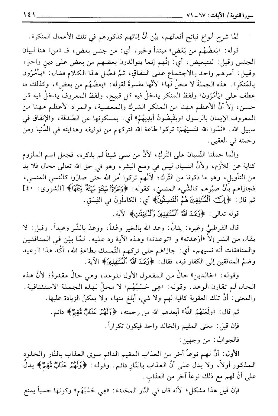 قال القرطبيُّ وغيره: يقالُ: وعد الله بالخير وعْداً، ووعدَ بالشَّر وعيداً. وقيل: لا يقال من الشر إلاَّ «أوْعدته» و «توعدته» وهذه الآية رد عليه. لمَّا بيَّن في المنافقين والمنافقات أنه نسيهم، أي: جازاهم على تركهم التَّمسك بطاعةِ الله، أكَّد هذا الوعيد وضمَّ المنافقين إلى الكفار فيه، فقال: {وَعَدَ الله الْمُنَافِقِينَ} الآية.