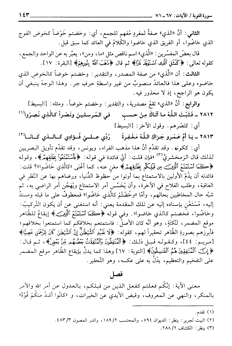 الثالث: أن «الَّذي» من صفة المصدر، والتقدير: وخضتم خوضاً كالخوضِ الذي خاضوه وعلى هذا فالعائدُ منصوبٌ من غير واسطةِ حرفِ جر. وهذا الوجهُ ينبغي أن يكون هو الراجح، إذ لا محذور فيه.