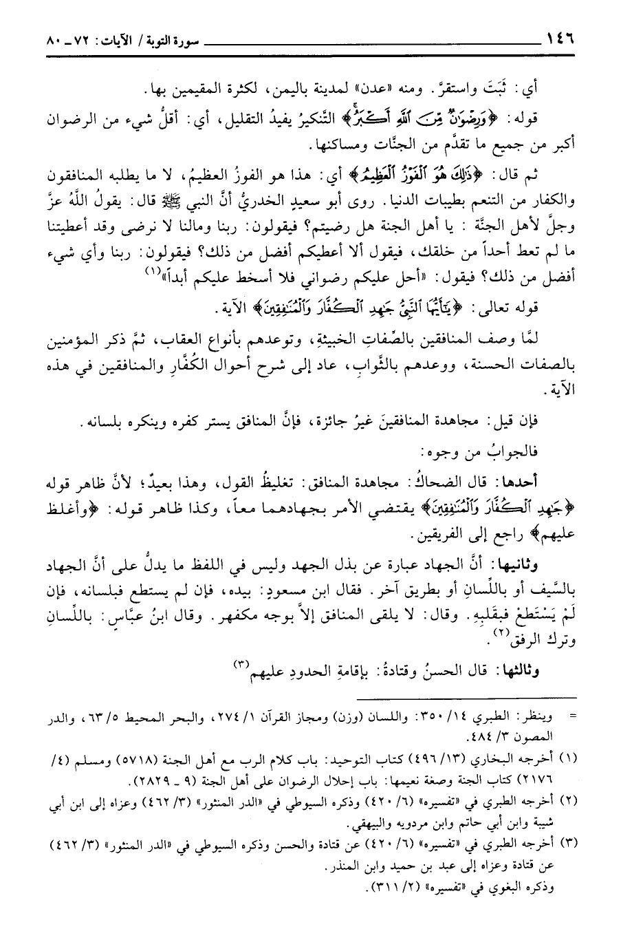 وثانيها: أنَّ الجهاد عبارة عن بذل الجهد وليس في اللفظ ما يدلُّ على أنَّ الجهاد بالسَّيف أو باللِّسانِ أو بطريق آخر. فقال ابن مسعودٍ: بيده، فإن لم يستطع فبلسانه، فإن لَمْ يَسْتَطعْ فبقَلبِهِ. وقال: لا يلقى المنافق إلاَّ بوجه مكفهر. وقال ابنُ عبَّاسٍ: باللِّسانِ وترك الرفق.