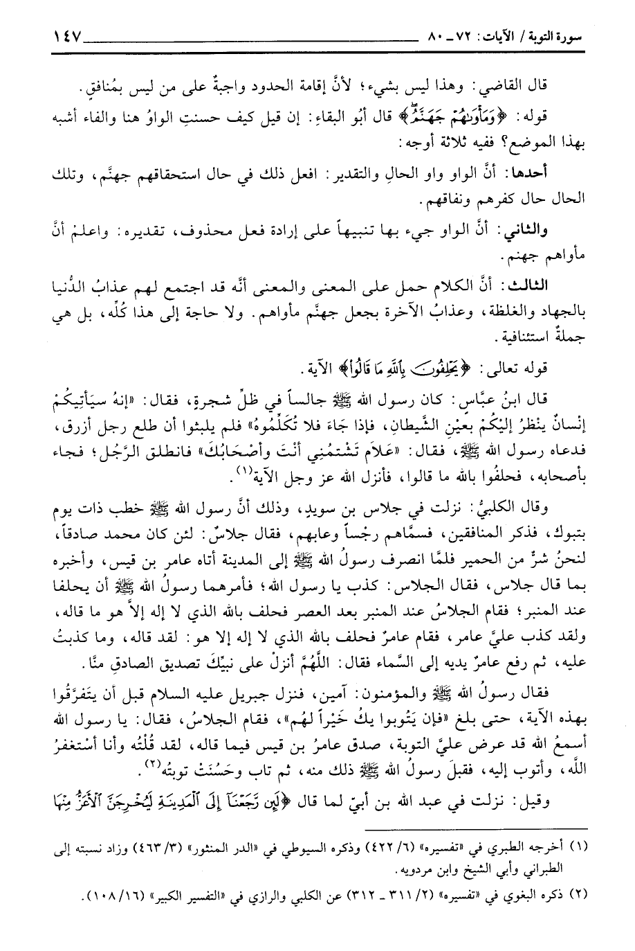 وقال الكلبيُّ: نزلت في جلاس بن سويدٍ، وذلك أنَّ رسول الله صَلَّى اللَّهُ عَلَيْهِ وَسَلَّم َ خطب ذات يوم بتبوك، فذكر المنافقين، فسمَّاهم رجْساً وعابهم، فقال جلاسٌ: لئن كان محمد صادقاً، لنحنُ شرٌّ من الحمير فلمَّا انصرف رسولُ الله صَلَّى اللَّهُ عَلَيْهِ وَسَلَّم َ إلى المدينة أتاه عامر بن قيس، وأخبره بما قال جلاس، فقال الجلاس: كذب يا رسول الله؛ فأمرهما رسولُ الله صَلَّى اللَّهُ عَلَيْهِ وَسَلَّم َ أن يحلفا عند المنبر؛ فقام الجلاسُ عند المنبر بعد العصر فحلف بالله الذي لا إله إلاَّ هو ما قاله، ولقد كذب عليَّ عامر، فقام عامرٌ فحلف بالله الذي لا إله إلا هو: لقد قاله، وما كذبتُ عليه، ثم رفع عامرٌ يديه إلى السَّماء فقال: اللَّهُمَّ انزلْ على نبيِّكَ تصديق الصادقِ منَّا.