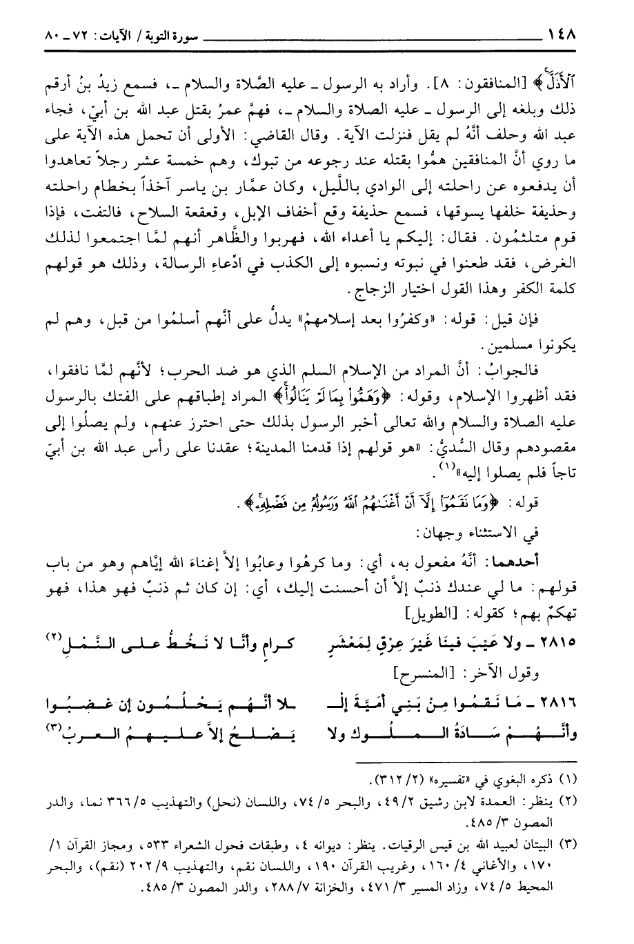 [المنافقون: 8] . وأراد به الرسول - عليه الصَّلاة والسلام -، فسمع زيدُ بنُ أرقم ذلك وبلغه إلى الرسول - عَلَيْهِ الصَّلَاة وَالسَّلَام ُ -، فهمَّ عمرُ بقتل عبد الله بن أبيّ، فجاء عبد الله وحلف أنَّهُ لم يقل فنزلت الآية. وقال القاضي: الأولى أن تحمل هذه الآية على ما روي أنَّ المنافقين همُّوا بقتله عند رجوعه من تبوك، وهم خسمة عشر رجلاً تعاهدوا أن يدفعوه عن راحلته إلى الوادي باللَّيل، وكان عمَّار بن ياسر آخذاً بخطام راحلته وحذيفة خلفها يسوقها، فسمع حذيفة وقع أخفاف الإبل، وقعقة السلاح، فالتفت، فإذا قوم متلثمُون. فقال: إليكم يا أعداء الله، فهربوا والظَّاهر أنهم لمَّا اجتمعوا لذلك الغرض، فقد طعنوا في نبوته ونسبوه إلى الكذب في ادِّعاءِ الرسالة، وذلك هو قولهم كلمة الكفر وهذا القول اختيار الزجاج.