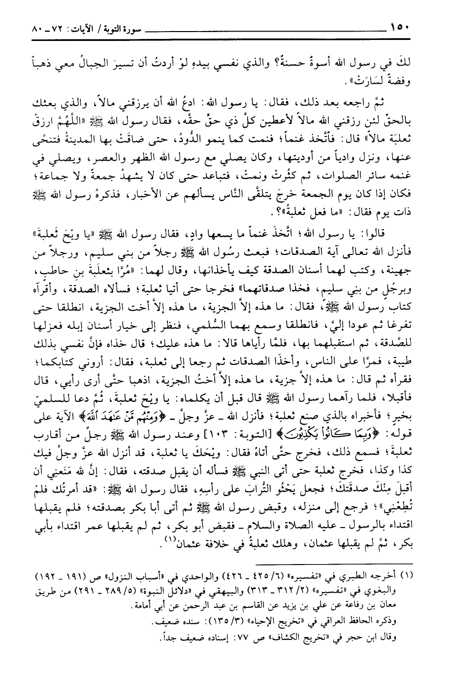 قالوا: يا رسول الله؛ اتَّخذَ غنماً ما يسعها وادٍ، فقال رسول الله صَلَّى اللَّهُ عَلَيْهِ وَسَلَّم َ «يا ويْحَ ثَعلبةَ» فأنزل الله تعالى آية الصدقات؛ فبعث رسُول الله صَلَّى اللَّهُ عَلَيْهِ وَسَلَّم َ رجلاً من بني سليم، ورجلاً من جهينة، وكتب لهما أسنان الصدقة كيف يأخذانها، وقال لهما: «مُرَّا بثعلَبَة بنِ حاطبٍ، وبرجُلٍ من بنِي سليمٍ، فخذا صدقاتهما» فخرجا حتى أتيا ثعلبة؛ فسألاه الصدقة، وأقرآه كتاب رسول الله صَلَّى اللَّهُ عَلَيْهِ وَسَلَّم َ، فقال: هذه إلاَّ الجزية، ما هذه إلاَّ أخت الجزية، انطلقا حتى تفرغا ثم عودا إليَّ، فانطلقا وسمع بهما السُّلمي، فنظر إلى خيار أسنان إبله فعزلها للصَّدقة، ثم استقبلهما بها، فلمَّا رأياها قالا: ما هذه عليك؛ قال خذاه فإنَّ نفسي بذلك طيبة، فمرَّا على الناس، وأخذَا الصدقات ثم رجعا إلى ثعلبة، فقال: أروني كتابكما؛ فقرأه ثم قال: ما هذه إلا جزية، ما هذه إلاَّ أختُ الجزية، اذهبا حتَّى أرى رأيي، قال فأقبلا، فلما رآهما رسول الله صَلَّى اللَّهُ عَلَيْهِ وَسَلَّم َ قال قبل أن يكلماه: يا ويْحَ ثعلبةَ، ثُمَّ دعا للسلميّ بخيرٍ؛ فأخبراه بالذي صنع ثعلبة؛ فأنزل الله - عزَّ وجلَّ - {وَمِنْهُمْ مَّنْ عَاهَدَ الله} الآية على قوله: {وَبِمَا كَانُواْ يَكْذِبُونَ} [التوبة: 77] وعند رسول الله صَلَّى اللَّهُ عَلَيْهِ وَسَلَّم َ رجلٌ من أقارب ثعلبةَ؛ فسمع ذلك، فخرج حتَّى أتاهُ فقال: ويْحَكَ يا ثعلبة، قد أنزل الله عزَّ وجلَّ فيك كذا وكذا، فخرج ثعلبة حتى أتى النبي صَلَّى اللَّهُ عَلَيْهِ وَسَلَّم َ فسأله أن يقبل صدقته، فقال: