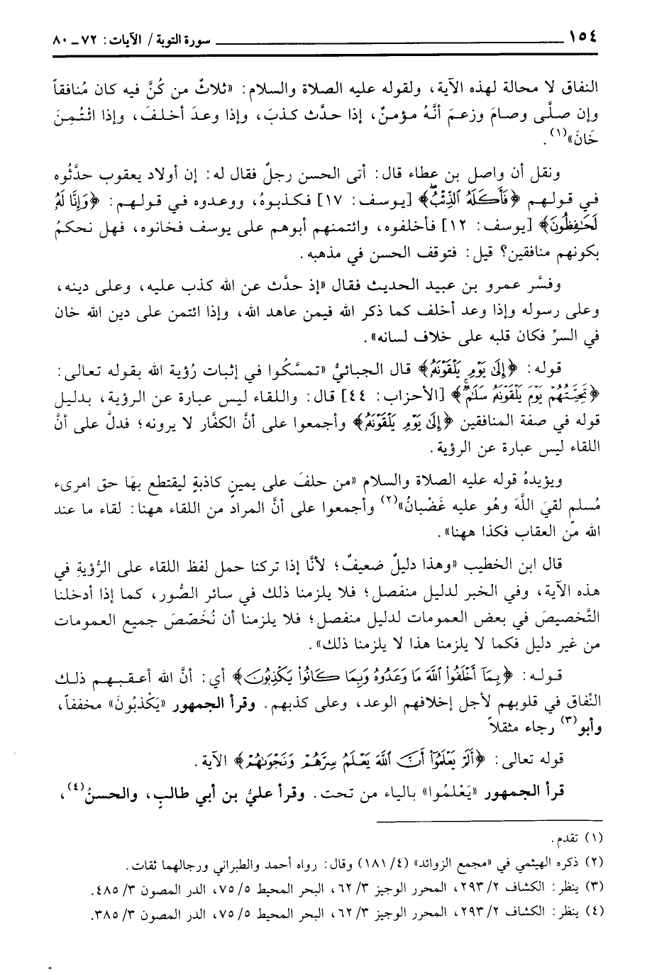 قوله: {إلى يَوْمِ يَلْقَوْنَهُ} قال الجبائيُّ «تمسَّكُوا في إثبات رُؤية الله بقوله تعالى: {تَحِيَّتُهُمْ يَوْمَ يَلْقَوْنَهُ سَلاَمٌ} [الأحزاب: 44] قال: واللقاء ليس عبارة عن الرؤية، بدليل قوله في صفة المنافقين {إلى يَوْمِ يَلْقَوْنَهُ} وأجمعوا على أنَّ الكفَّار لا يرونه؛ فدلَّ على أنَّ اللقاء ليس عبارة عن الرؤية.