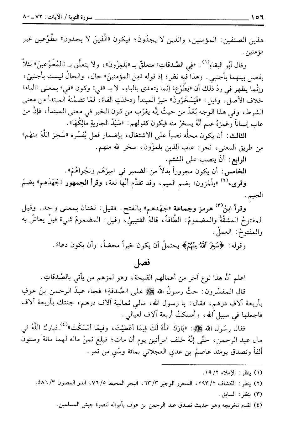 وقال أبُو البقاءِ: «فِي الصَّدقاتِ» متعلقٌ ب «يَلمِزُونَ» ، ولا يتعلَّق ب «المُطَّوِّعينَ» لئلاَّ يفصل بينهما بأجنبي. وهذا فيه نظر؛ إذ قوله «مِنَ المؤمنينَ» حال، والحالُ ليست بأجنبيّ، وإنَّما يظهر في ردِّ ذلك أن «يطَّوَّع» إنَّما يتعدى بالياءِ، لا ب «في» وكون «في» بمعنى «الباء» خلاف الأصل. وقيل: «فَيَسْخَرُونَ» خبرُ المبتدأ ودخلتِ الفاءُ، لمَا تضمَّنهُ المبتدأ من معنى الشرط، وفي هذا الوجه بُعدٌ من حيثُ إنَّه يقرُب من كون الخبر في معنى المبتدأ فإنَّ من عاب إنساناً وغمزهُ علم أنَّهُ يسخرُ منه فيكون كقولهم: «سَيِّدُ الجاريةِ مالِكُهَا» .