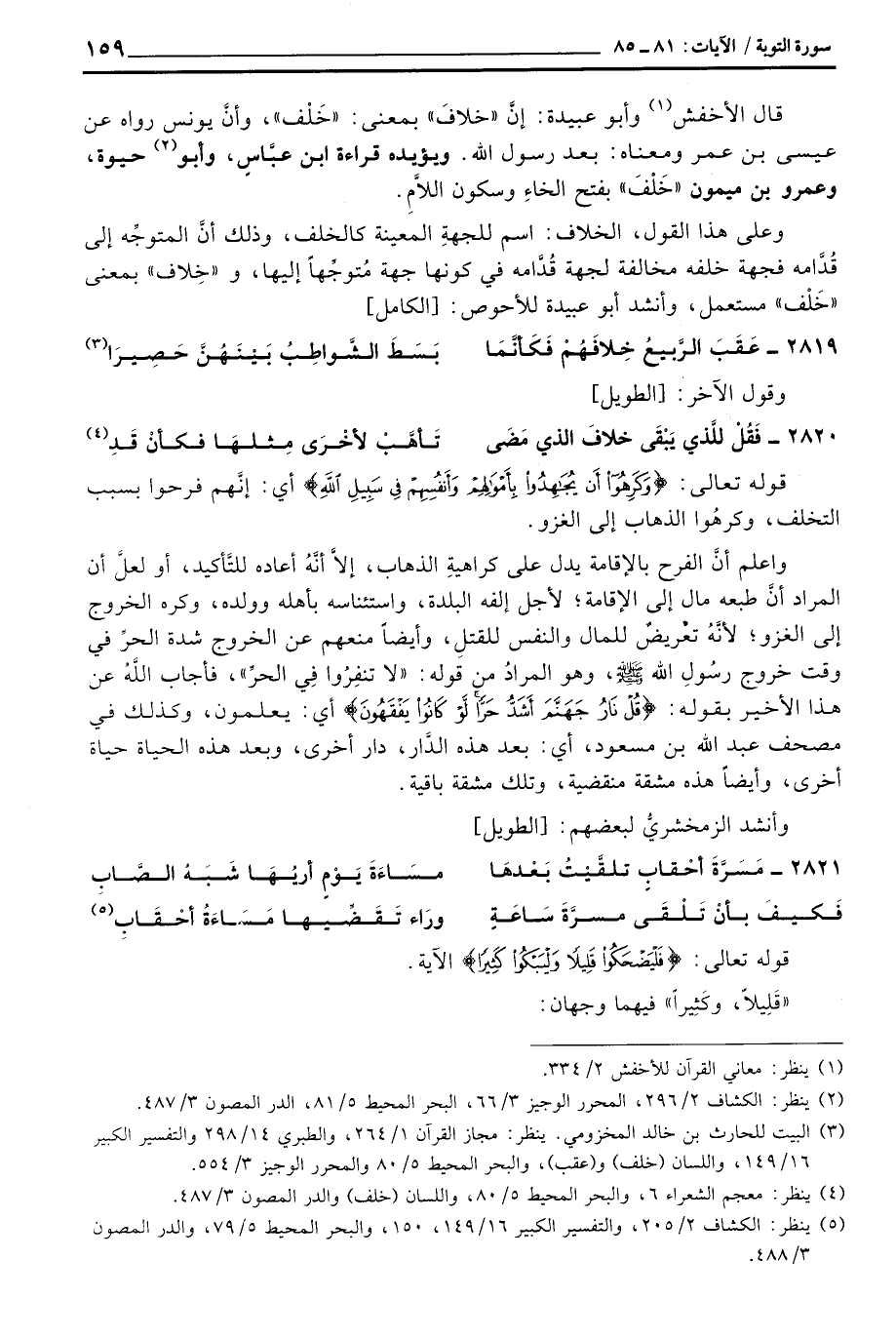 قال الأخفش وأبو عبيدة: إنَّ» خلافَ «بمعنى:» خَلْف «، وأنَّ يونس رواه عن عيسى بن عمر ومعناه: بعد رسول الله. ويؤيده قراءة ابن عبَّاسٍ، وأبو حيوة، وعمرو بن ميمون» خَلْفَ «بفتح الخاءِ وسكون اللاَّمِ.