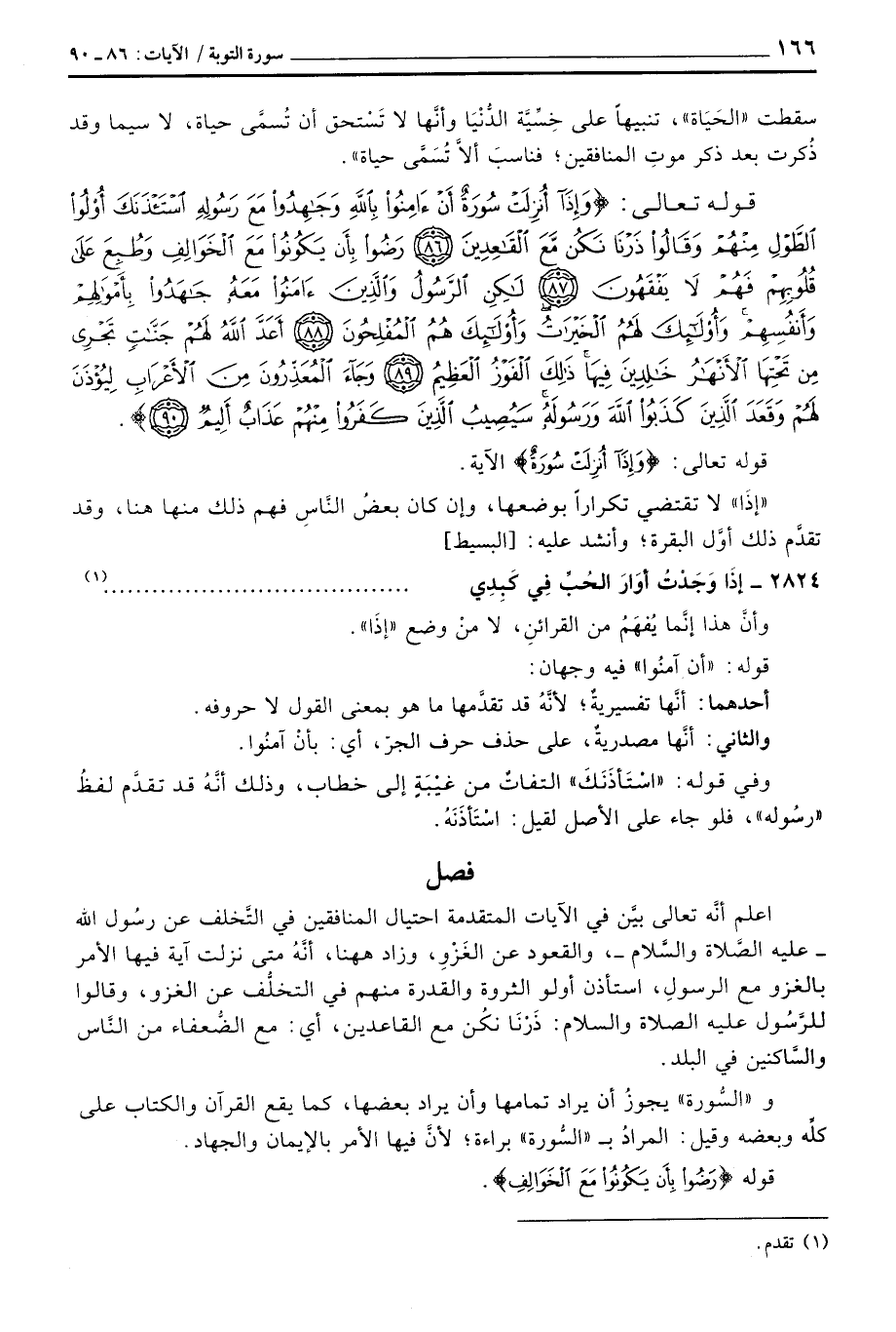 و» السُّورة «يجوزُ أن يراد تمامها وأن يراد بعضها، كما يقع القرآن والكتاب على كلِّه وبعضه وقيل: المرادُ ب» السُّورة «براءة؛ لأنَّ فيها الأمر بالإيمان والجهاد.