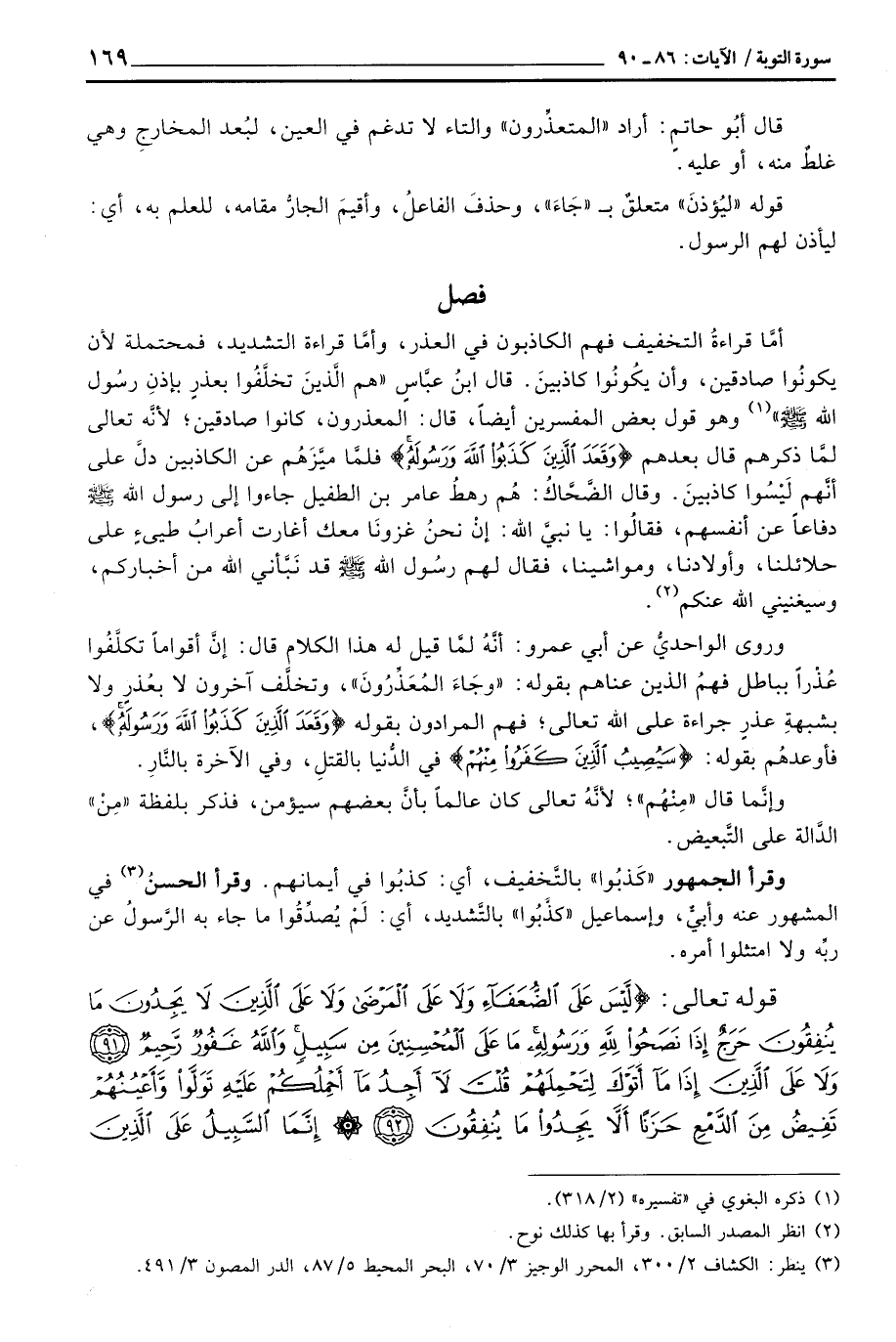 وروى الواحديُّ عن أبي عمرو: أنَّهُ لمَّا قيل له هذا الكلام قال: إنَّ أقواماً تكلَّفُوا عُذْراً بباطل فهمُ الذين عناهم بقوله: «وَجَآءَ المعذرون» ، وتخلَّف آخرون لا بعُذر ولا بشبهةِ عذرٍ جراءة على الله تعالى؛ فهم المرادون بقوله {وَقَعَدَ الذين كَذَبُواْ الله وَرَسُولَهُ} ، فأوعدهُم بقوله: {سَيُصِيبُ الذين كَفَرُواْ مِنْهُمْ} في الدُّنيا بالقتلِ، وفي الآخرة بالنَّارِ.