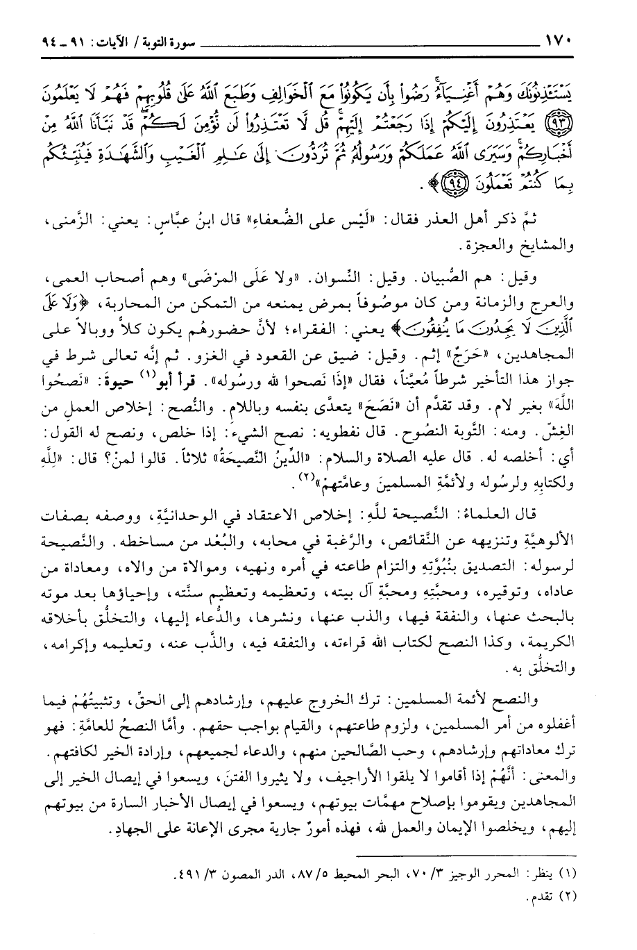 وقيل: هم الصُّبيان. وقيل: النِّسوان. {وَلاَ على المرضى} وهم أصحاب العمى، والعرج والزمانة ومن كان موصُوفاً بمرض يمنعه من التمكن من المحاربة، {وَلاَ عَلَى الذين لاَ يَجِدُونَ مَا يُنفِقُونَ} يعني: الفقراء؛ لأنَّ حضورهُم يكون كلاًّ ووبالاً على المجاهدين، «حَرَجٌ» إثم. وقيل: ضيق عن القعود في الغزو. ثم إنَّه تعالى شرط في جواز هذا التأخير شرطاً مُعيَّناً، فقال {إِذَا نَصَحُواْ للَّهِ وَرَسُولِهِ} . قرأ أبو حيوةَ: «نَصَحُوا اللهَ» بغير لام. وقد تقدَّم أن «نَصَحَ» يتعدَّى بنفسه وباللامِ. والنُّصح: إخلاص العملِ من الغِشّ. ومنه: التَّوبة النصُوح. قال نفطويه: نصح الشيء: إذا خلص، ونصح له القول: أي: أخلصه له. قال عَلَيْهِ الصَّلَاة وَالسَّلَام ُ: «الدِّينُ النَّصيحَةُ» ثلاثاً. قالوا لمنْ؟ قال: «للهِ ولكتابِهِ ولرسُوله ولأئمَّةِ المسلمينَ وعامَّتهمْ» .