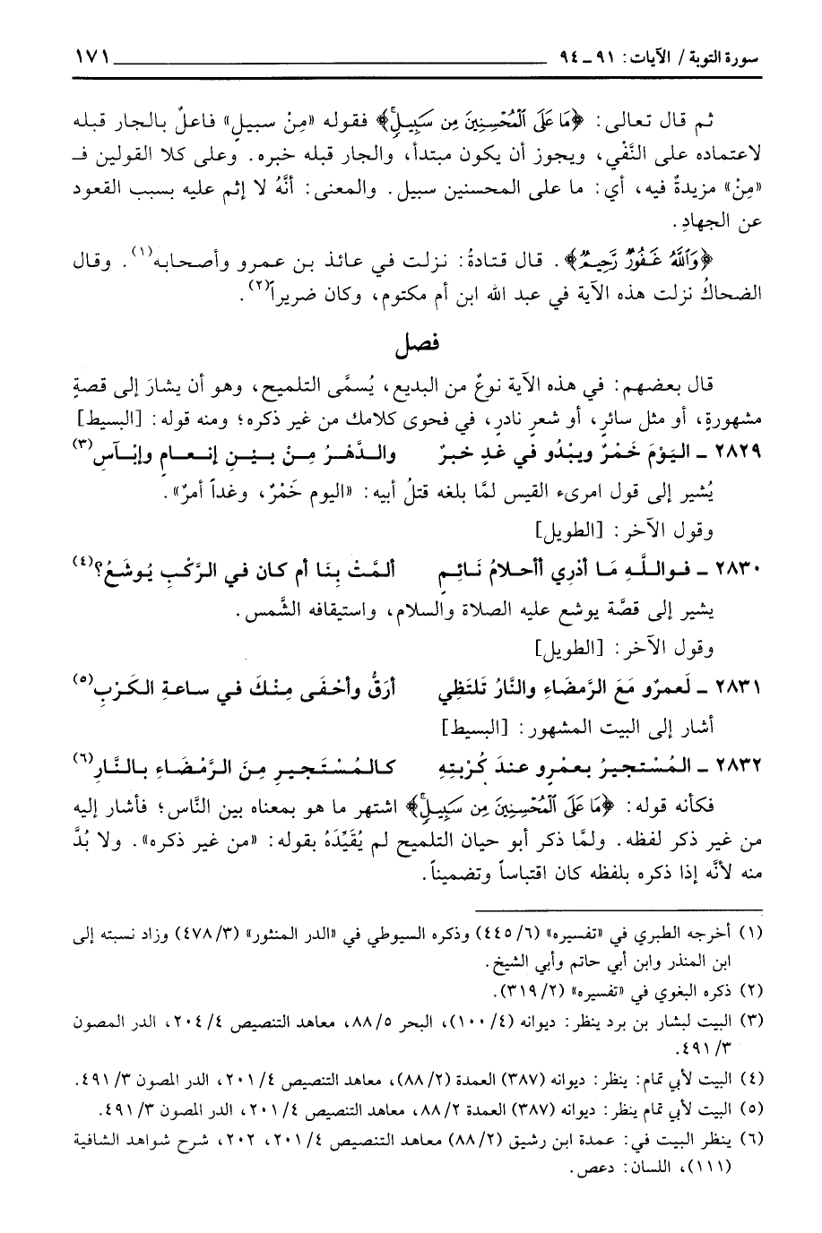 فكأنه قوله: {مَا عَلَى المحسنين مِن سَبِيلٍ} اشتهر ما هو بمعناه بين النَّاس؛ فأشار إليه من غير ذكر لفظه. ولمَّا ذكر أبو حيان التلميح لم يُقَيِّدَهُ بقوله: «من غير ذكره» . ولا بُدَّ منه لأنَّه إذا ذكره بلفظه كان اقتباساً وتضميناً.