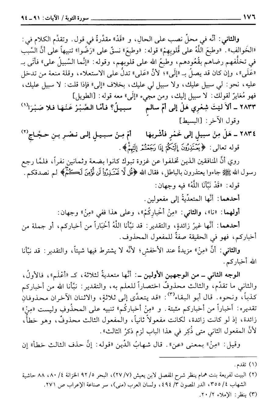 والثاني: أنَّه في محلِّ نصب على الحالِ، و» قَدْ «مقدَّرةٌ في قول. وتقدَّم الكلام في:» الخَوالفِ «.» وطبعَ اللهُ على قُلوبِهِمْ «قوله:» وطبعَ «نسقٌ على» رَضُوا «تنبيهاً على أنَّ السَّبب في تخلُّفهم رضاهم بقُعُودهم، وطبعُ الله على قلوبهم، وقوله:» إنَّما السَّبيلُ على «فأتَى ب» عَلَى «، وإن كان قد يصلُ ب» إلَى «؛ لأنَّ» عَلى «تدلُّ على الاستعلاء، وقلة منعة من تدخل عليه، نحو: لي سبيل عليك، ولا سبيل لي عليك، بخلاف» إلى «فإذا قلت: لا سبيل عليك، فهو مُغايرٌ لقولك: لا سبيل إليك، ومن مجيء» إلَى «معه قوله: [الطويل]