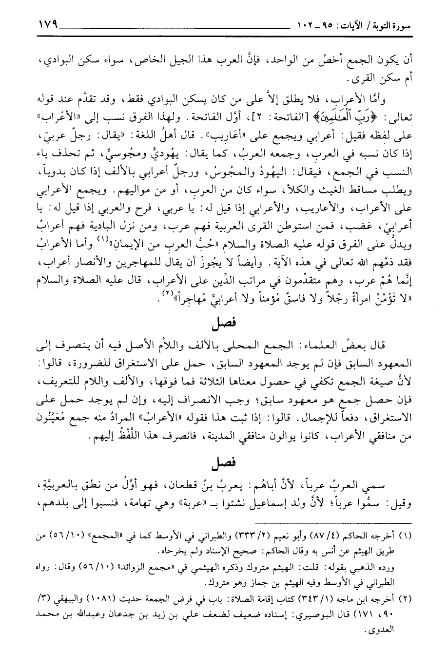 أن يكون الجمع أخصَّ من الواحد، فإنَّ العرب هذا الجيل الخاص، سواء سكن البوادي، أم سكن القرى.
