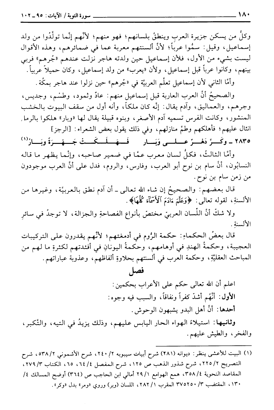 ولا شكّ أنَّ اللِّسان العربيّ مختصّ بأنواع الفصاحةِ والجزالة، لا توجدُ في سائرِ الألسنةِ.