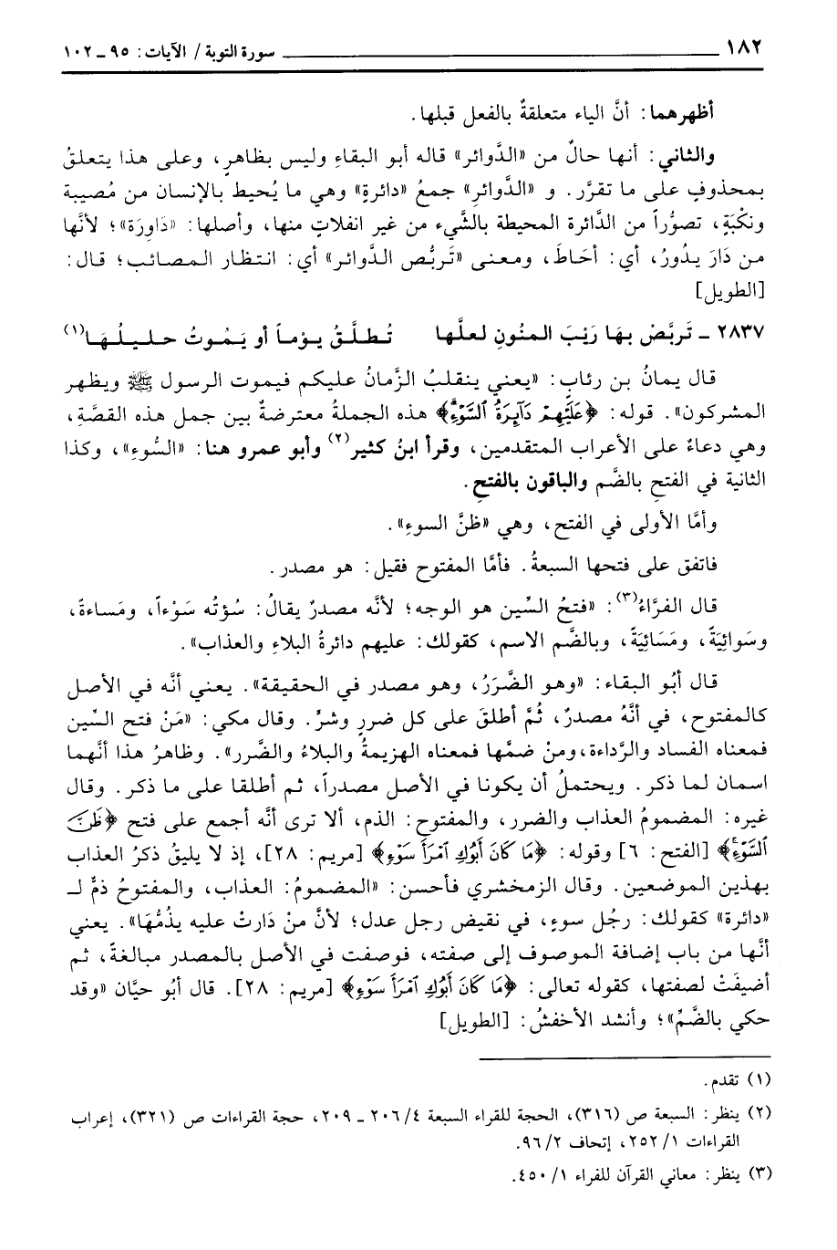 قال أبُو البقاء: «وهو الضَّرَرُ، وهو مصدر في الحقيقة» . يعني أنَّه في الأصل كالمفتوح، في أنَّهُ مصدرٌ، ثُمَّ أطلقَ على كل ضررٍ وشرٍّ. وقال مكي: «مَنْ فتح السِّين فمعناه الفساد والرَّداءة، ومنْ ضمَّها فمعناه الهزيمةُ والبلاءُ والضَّرر» . وظاهرُ هذا أنَّهما اسمان لما ذكر. ويحتملُ أن يكونا في الأصل مصدراً ثم أطلقا على ما ذكر. وقال غيره: المضمومُ العذاب والضرر، والمفتوح: الذم، ألا ترى أنَّه أجمع على فتح {ظَنَّ السوء} [الفتح: 6] وقوله: {مَا كَانَ أَبُوكِ امرأ سَوْءٍ} [مريم: 28] ، إذ لا يليقُ ذكرُ العذاب بهذين الموضعين. وقال الزمخشري فأحسن: «المضمومُ: العذاب، والمفتوحُ ذمٌّ ل» دائرة «كقولك: رجُل سوءٍ، في نقيض رجل عدل؛ لأنَّ منْ دَارتْ عليه يذُمُّهَا» . يعني أنَّها من باب إضافة الموصوف إلى صفته، فوصفت في الأصل بالمصدر مبالغةً، ثم أضيفَتْ لصفتها، كقوله تعالى: