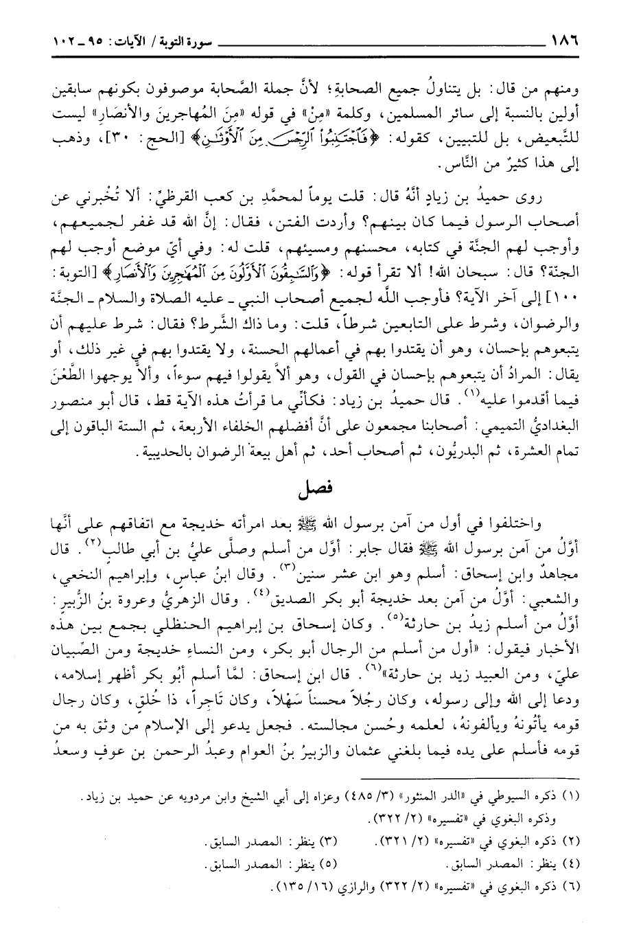 ومنهم من قال: بل يتناولُ جميع الصحابةِ؛ لأنَّ جملة الصَّحابة موصوفون بكونهم سابقين أولين بالنسبة إلى سائر المسلمين، وكلمة «مِنْ» في قوله «مِنَ المُهاجرينَ والأنصَارِ» ليست للتَّبعيض، بل للتبيين، كقوله: {فاجتنبوا الرجس مِنَ الأوثان} [الحج: 30] ، وذهب إلى هذا كثيرٌ من النَّاس.