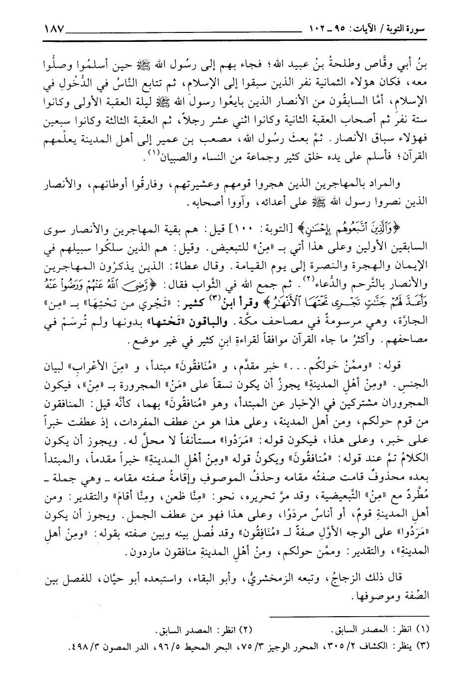 والمراد بالمهاجرين الذين هاجروا قومه وعشيرتهم، وفارقُوا أوطانهم، والأنصار الذين نصروا رسول الله صَلَّى اللَّهُ عَلَيْهِ وَسَلَّم َ على أعدائه، وآووا أصحابه.