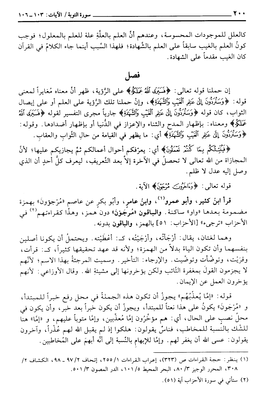 قرأ ابنُ كثير، وأبو عمرو، وابنُ عامرٍ، وأبُو بكرٍ عن عاصم «مُرْجؤونَ» بهمزة مضمومة بعدها «واو» ساكنة. والباقون «مُرجَوْنَ» دون همز، وهذا كقراءتهم في الأحزاب «ترجىء» [الأحزاب: 51] بالهمز، والباقون بدونه.