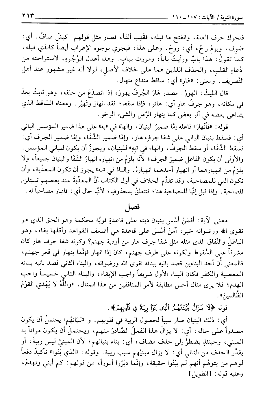 معنى الآية: أفمَنْ أسَّس بنيان دينه على قاعدةٍ قويَّة محكمة وهو الحق الذي هو تقوى الله ورضوانه خير، أمَّنْ أسَّسَ على قاعدة هي أضعف القواعد وأقلها بقاء، وهو الباطلُ والنِّفاق الذي مثله مثل شفا جرف هار من أودية جهنم؟ وكونه شفا جرف هار كان مشرفاً على السُّقوط ولكونه على طرف جهنم، كان إذا انهار فإنَّما ينهار في قعر جهنم، فالمعنى أنَّ أحد البنائين قصد بانيه ببنائه تقوى الله ورضوانه، والبناء الثاني قصد بانيه ببنائه المعصية والكفر فكان البناء الأول شريفاً واجب الإبقاء، والبناء الثاني خسيساً واجب الهدم؛ فلا يرى مثال أخس مطابقة لأمر المنافقين من هذا المثال، {والله لاَ يَهْدِي القوم الظالمين} .