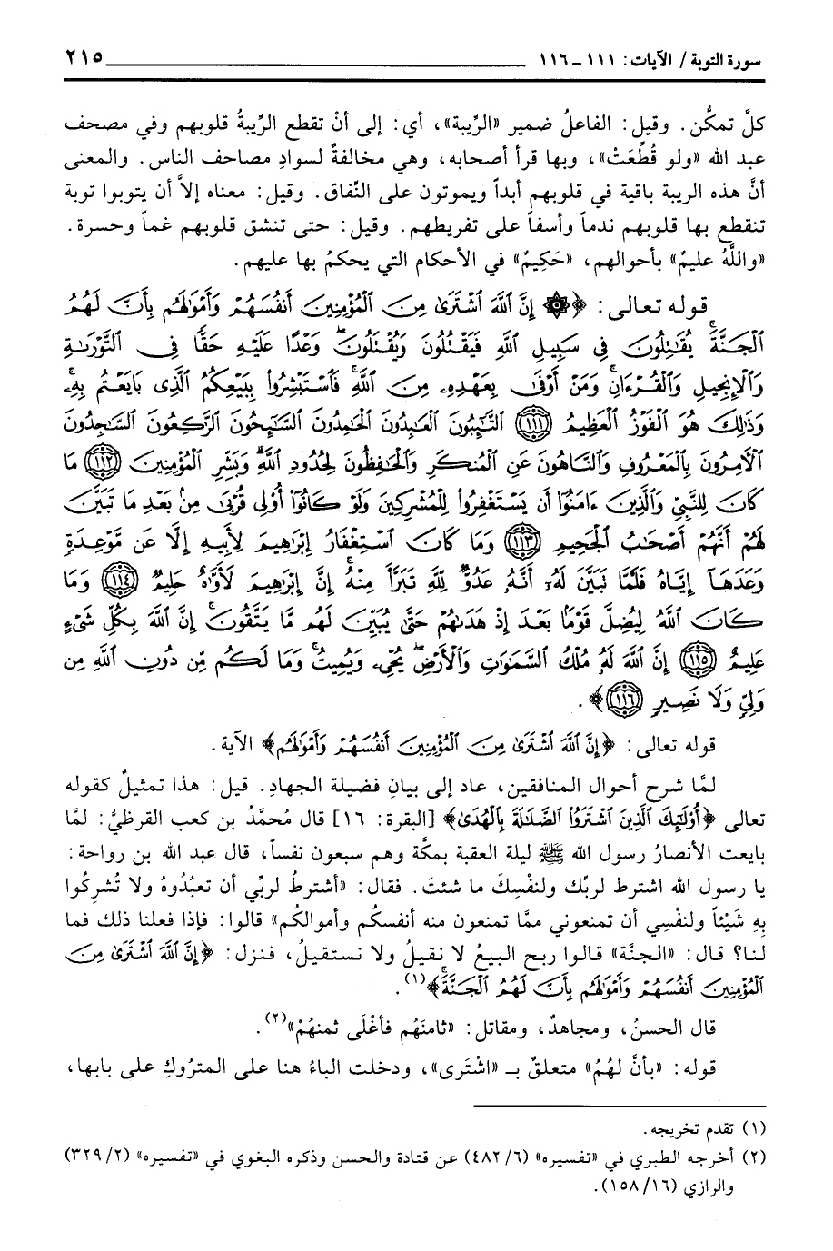 لمَّا شرح أحوال المنافقين، عاد إلى بيانِ فضيلة الجهادِ. قيل: هذا تمثيلٌ كقوله تعالى {أولئك الذين اشتروا الضلالة بالهدى} [البقرة: 16] قال مُحمَّدُ بن كعب القرظيُّ: «لمَّا بايعت الأنصارُ رسول الله صَلَّى اللَّهُ عَلَيْهِ وَسَلَّم َ ليلة العقبة بمكَّة وهم سبعون نفساً، قال عبد الله بن رواحة: يا رسول الله اشترط لربِّك ولنفْسِكَ ما شئتَ. فقال:» أشترطُ لربِّي أن تعبُدُوهُ ولا تُشرِكُوا بِهِ شَيْئاً ولنفْسِي أن تمنعوني ممَّا منعون منه أنفسكُم وأموالكُم «قالوا: فإذا فعلنا ذلك فما لنا؟ قال:» الجنَّة «قالوا ربح البيعُ لا نقيلُ ولا نستقيلُ» ، فنزل: {إِنَّ الله اشترى مِنَ المؤمنين أَنفُسَهُمْ وَأَمْوَالَهُمْ بِأَنَّ لَهُمُ الجنة} .