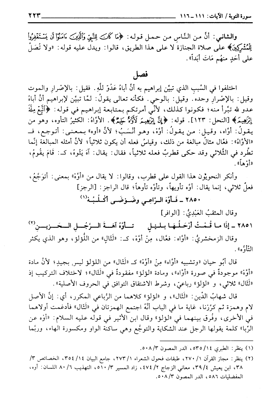 اختلفوا في السَّببِ الذي تبيَّن إبراهيم به أنَّ أباهُ عَدُوّ للهِ. فقيل: بالإصْرارِ والموت وقيل: بالإصْرارِ وحده. وقيل: بالوحي. فكأنه تعالى يقولُ: لمَّا تبيَّن لإبراهيم أنَّ أباهُ عدو لله تبَّرأ منه؛ فكونوا كذلك، لأنِّي أمرتكم بمتابعة إبراهيم في قوله: {اتبع مِلَّةَ إِبْرَاهِيمَ} [النحل: 123] . قوله: {إِنَّ إِبْرَاهِيمَ لأَوَّاهٌ حَلِيمٌ} . الأوَّاهُ: الكثيرُ التأوه، وهو من يقولُ: أوَّاه، وقيل: من يقولُ: أوَّهْ، وهو أنْسَبُ؛ لأنَّ «أوه» بمعنى: أتوجع، ف «الأوَّاهُ» : فعَّال مثالُ مبالغة من ذلك، وقياسُ فعله أن يكون ثلاثياً؛ لأنَّ أمثله المبالغة إنَّما تطَّرد في الثُّلاثي وقد حكى قطربٌ فعله ثلاثياً، فقال: يقال: آهَ يَئُوهُ، ك «قَامَ يقُومُ،» أوْهاً «.