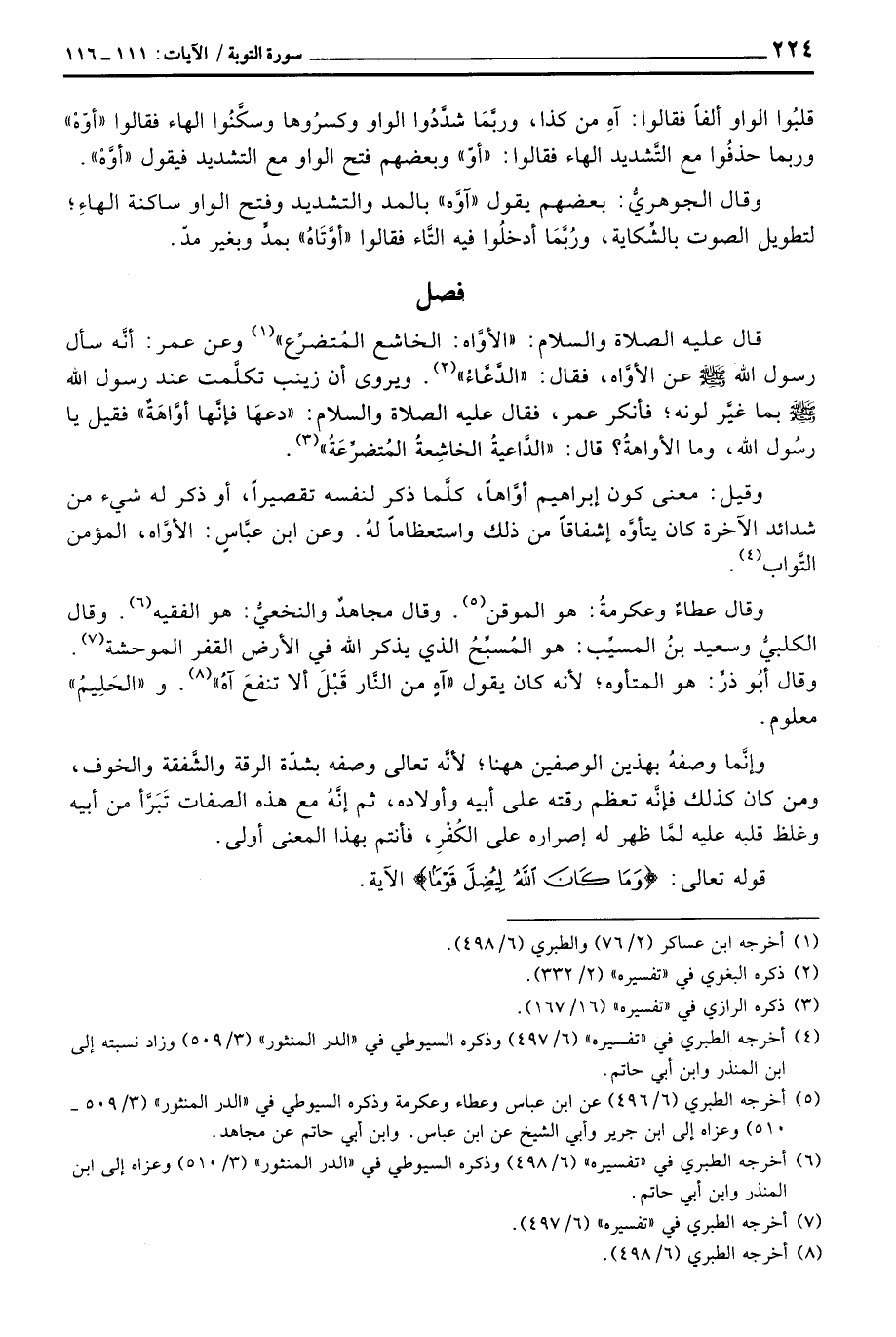 قال عَلَيْهِ الصَّلَاة وَالسَّلَام ُ: «الأوَّاه: الخاشع المُتضرِّع» وعن عمر: «الدُّعَّاءُ أنَّهُ سأل رسول الله صَلَّى اللَّهُ عَلَيْهِ وَسَلَّم َ عن الأوَّاه، فقال:» ويروى «أن زينب تكلَّمت عند رسول الله صَلَّى اللَّهُ عَلَيْهِ وَسَلَّم َ بما غيَّر لونه؛ فأنكر عمر، فقال عَلَيْهِ الصَّلَاة وَالسَّلَام ُ: دعهَا فإنَّها أوَّاهَةٌ» فقيل يا رسُول الله، وما الأواهةُ؟ قال: «الدَّاعيةُ الخاشِعةُ المُتضرِّعَةُ» .