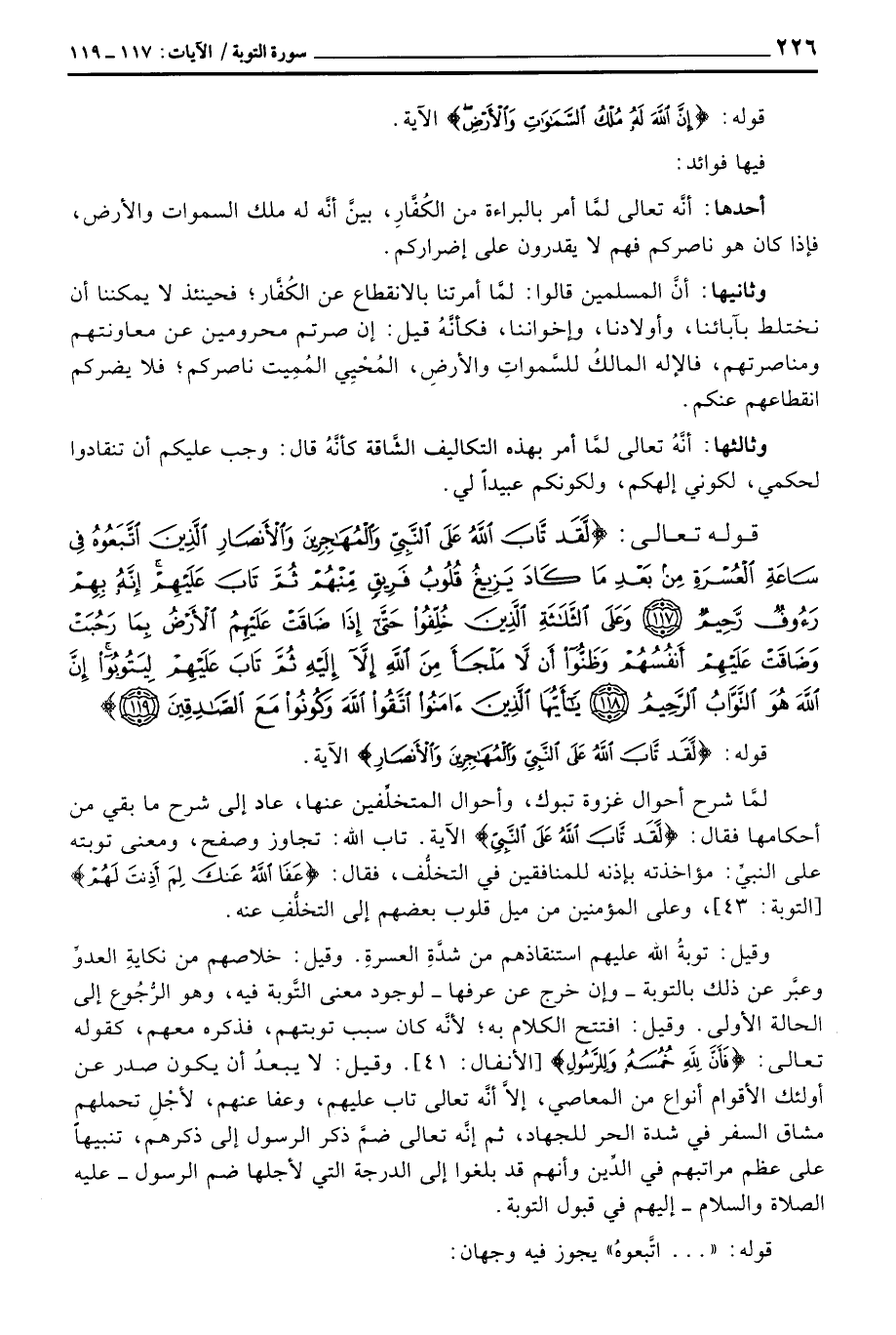 وقيل: توبةُ الله عليهم استنقاذهم من شدَّةِ العسرةِ. وقيل: خلاصهم من نكايةِ العدوِّ وعبَّر عن ذلك بالتوبة - وإن خرج عن عرفها - لوجود معنى التَّوبة فيه، وهو الرُّجُوع إلى الحالة الأولى. وقيل: افتتح الكلام به؛ لأنَّه كان سبب توبتهم، فذكره معهم، كقوله تعالى: {فَأَنَّ للَّهِ خُمُسَهُ وَلِلرَّسُولِ} [الأنفال: 41] . وقيل: لا يبعدُ أن يكون صدر عن أولئك الأقوام أنواع من المعاصي، إلاَّ أنَّه تعالى تاب عليهم، وعفا عنهم، لأجْلِ تحملهم مشاق السفر في شدة الحر للجهاد، ثم إنَّه تعالى ضمَّ ذكر الرسول إلى ذكرهم، تنبيهاً على عظم مراتبهم في الدِّين وأنهم قد بلغوا إلى الدرجة التي لأجلها ضم الرسول - عَلَيْهِ الصَّلَاة وَالسَّلَام ُ - إليهم في قبول التوبة.