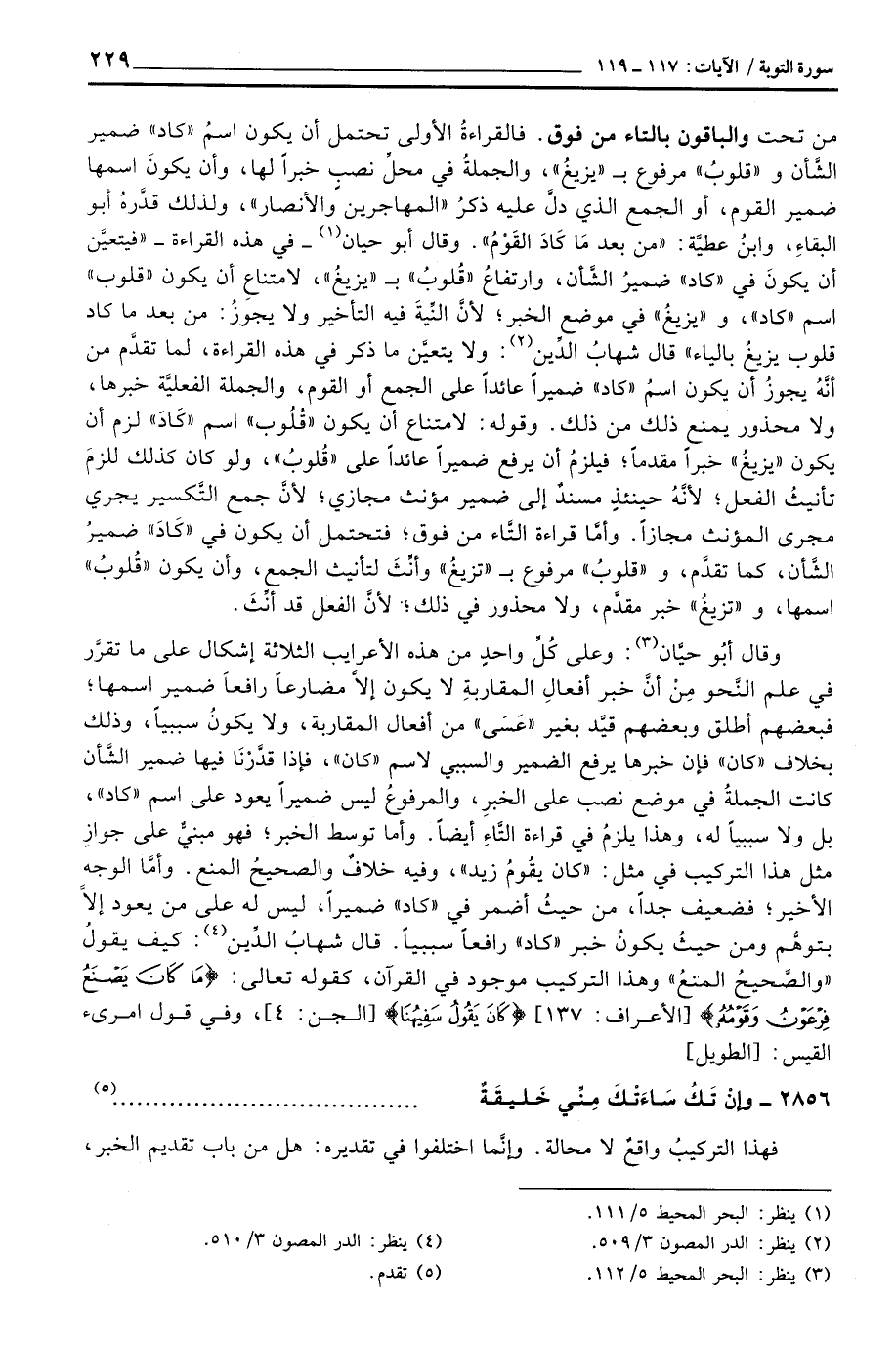 وقال أبُو حيَّان: وعلى كُلِّ واحدٍ من هذه الأعرايب الثلاثة إشكال على ما تقرَّر في علم النَّحو مِنْ أنَّ خبر أفعالِ المقاربةِ لا يكون إلاَّ مضارعاً رافعاً ضمير اسمها؛ فبعضهم أطلق وبعضهم قيَّد بغير» عَسَى «من أفعال المقاربة، ولا يكونُ سبباً، وذلك بخلاف» كان «فإن خبرها يرفع الضمير والسبي لاسم» كان «، فإذا قدَّرْنَا فيها ضمير الشَّأن كانت الجملةُ في موضع نصب على الخبرِ، والمرفوعُ ليس ضميراً يعود على اسم» كاد «، بل ولا سبباً له، وهذا يلزمُ في قراءة التَّاءِ أيضاً.