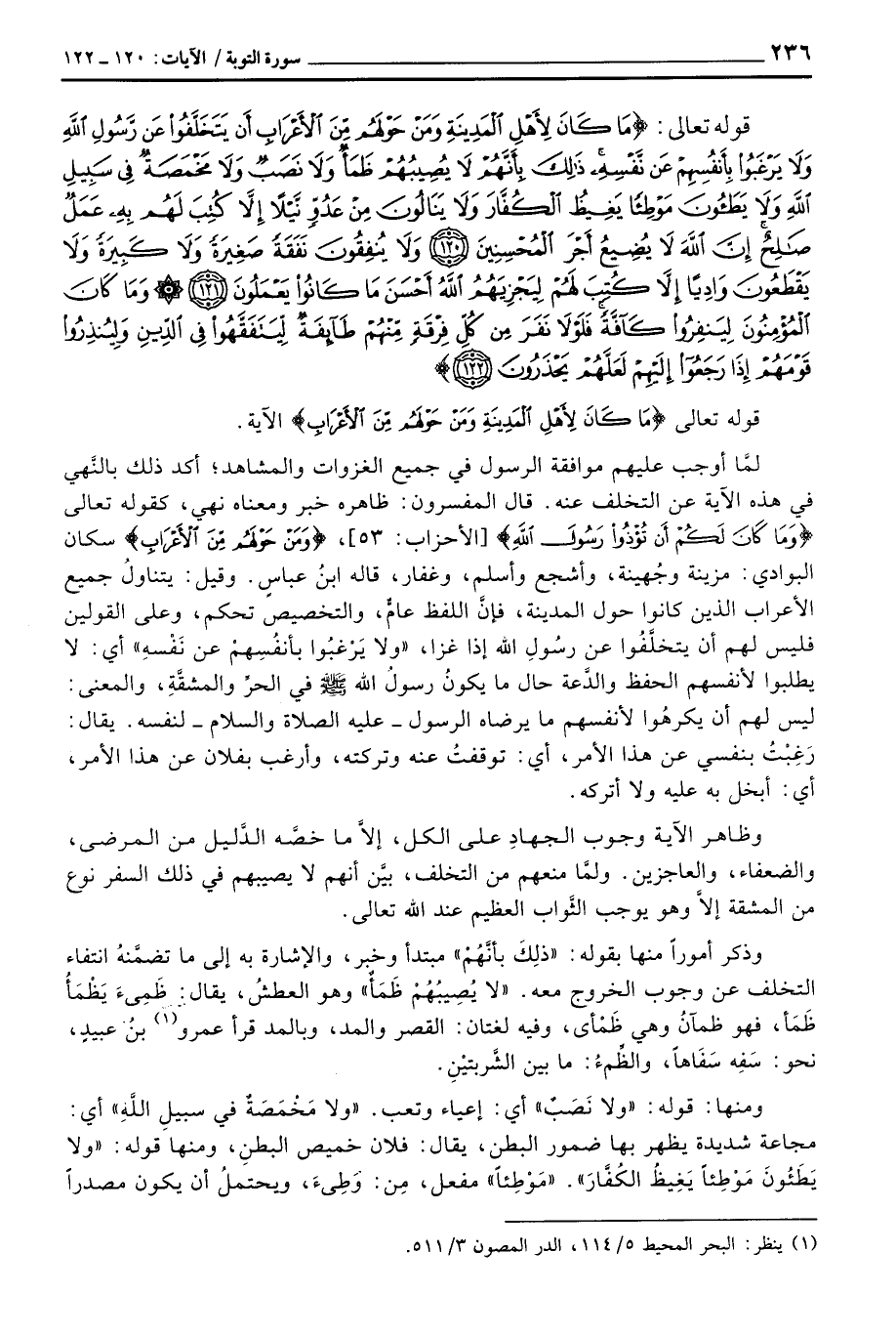وظاهر الآية وجوب الجهادِ على الكل، إلاَّ ما خصَّه الدَّليل من المرضى، والضعفاء، والعاجزين. ولمَّا منعهم من التخلف، بيَّن أنهم لا يصيبهم في ذلك السفر نوع من المشقة إلاَّ وهو يوجب الثَّواب العظيم عند الله تعالى.
