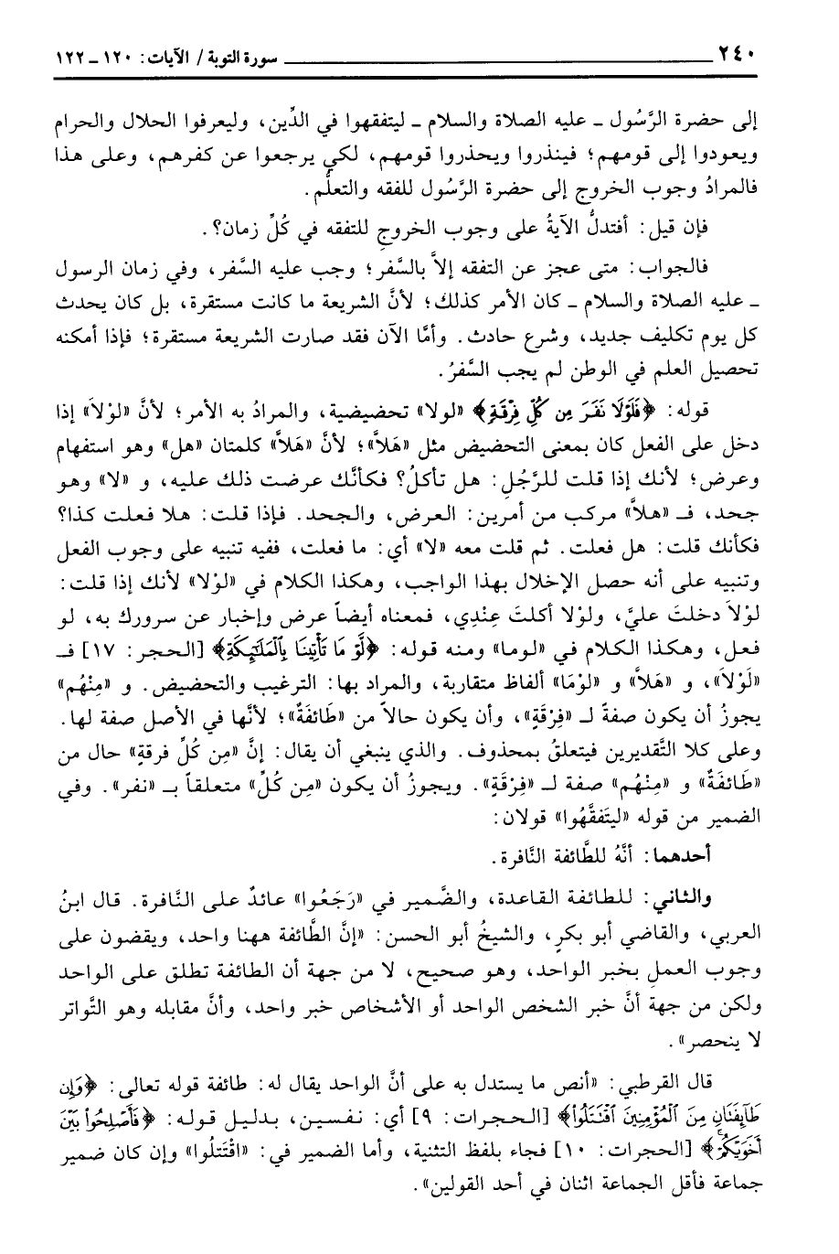 إلى حضرة الرَّسُول - عَلَيْهِ الصَّلَاة وَالسَّلَام ُ - ليتفقهوا في الدِّين، وليعرفوا الحلال والحرام ويعودوا إلى قومهم؛ فينذروا ويحذروا قومهم، لكي يرجعوا عن كفرهم، وعلى هذا فالمرادُ وجوب الخروج إلى حضرة الرَّسُول للفقه والتعلُّم.
