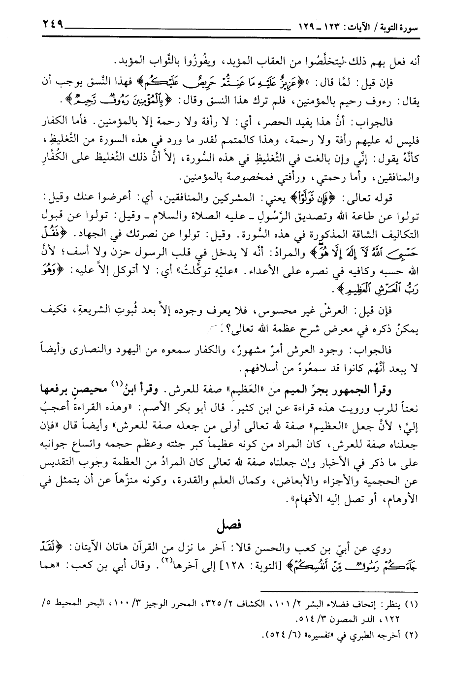 قوله تعالى: {فَإِن تَوَلَّوْاْ} يعني: المشركين والمنافقين، أي: أعرضوا عنك وقيل: تولوا عن طاعة الله وتصديق الرَّسُولِ - عَلَيْهِ الصَّلَاة وَالسَّلَام ُ - وقيل: تولوا عن قبول التكاليف الشاقة المذكورة في هذه السُّورة. وقيل: تولوا عن نصرتك في الجهاد. {فَقُلْ حَسْبِيَ الله لاا إله إِلاَّ هُوَ} والمرادُ: أنَّه لا يدخل في قلب الرسول حزن ولا أسف؛ لأنَّ الله حسبه وكافيه في نصره على الأعداء. «عليْهِ توكَّلتُ» أي: لا أتوكل إلاَّ عليه: {وَهُوَ رَبُّ العرش العظيم} .