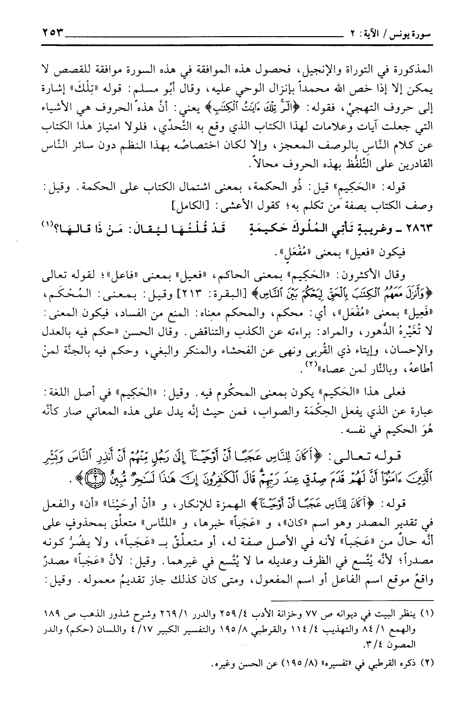 وقال الأكثرون: «الحَكِيم» بمعنى الحاكم، «فعيل» بمعنى «فاعل» ؛ لقوله تعالى {وَأَنزَلَ مَعَهُمُ الكتاب بالحق لِيَحْكُمَ بَيْنَ الناس} [البقرة: 213] وقيل: بمعنى: المُحْكَم، «فَعِيل» بمعنى «مُفْعَل» ، أي: محكم، والمحكم معناه: المنع من الفساد، فيكون المعنى: لا تُغَيِّرهُ الدُّهور، والمراد: براءته عن الكذب والتناقض. وقال الحسن «حكم فيه بالعدل والإحسان، وإيتاء ذي القُربى ونهى عن الفحشاء والمنكر والبغي، وحكم فيه بالجنَّة لمنْ أطاعهُ، وبالنَّار لمن عصاه» .