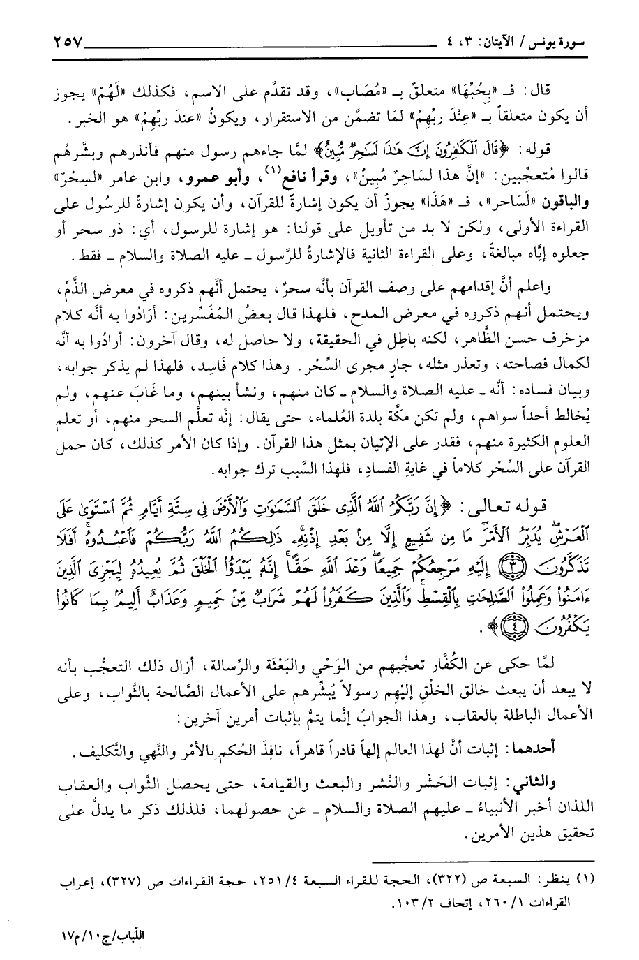 قوله: {قَالَ الكافرون إِنَّ هذا لَسَاحِرٌ مُّبِينٌ} لمَّا جاءهم رسول منهم فأنذرهم وبشَّرهُم قالوا مُتعجِّبين: «إنَّ هذا لسَاحِرٌ مُبِينٌ» ، وقرأ نافع، وأبو عمرو، وابن عامر «لسِحْرٌ» والباقون «لَسَاحر» ، ف «هَذَا» يجوزُ أن يكون إشارةً للقرآن، وأن يكون إشارةً للرسُول على القراءة الأولى، ولكن لا بد من تأويل على قولنا: هو إشارة للرسول، أي: ذو سحر أو جعلوه إيَّاه مبالغةً، وعلى القراءة الثانية فالإشارةُ للرَّسول - عَلَيْهِ الصَّلَاة وَالسَّلَام ُ - فقط.