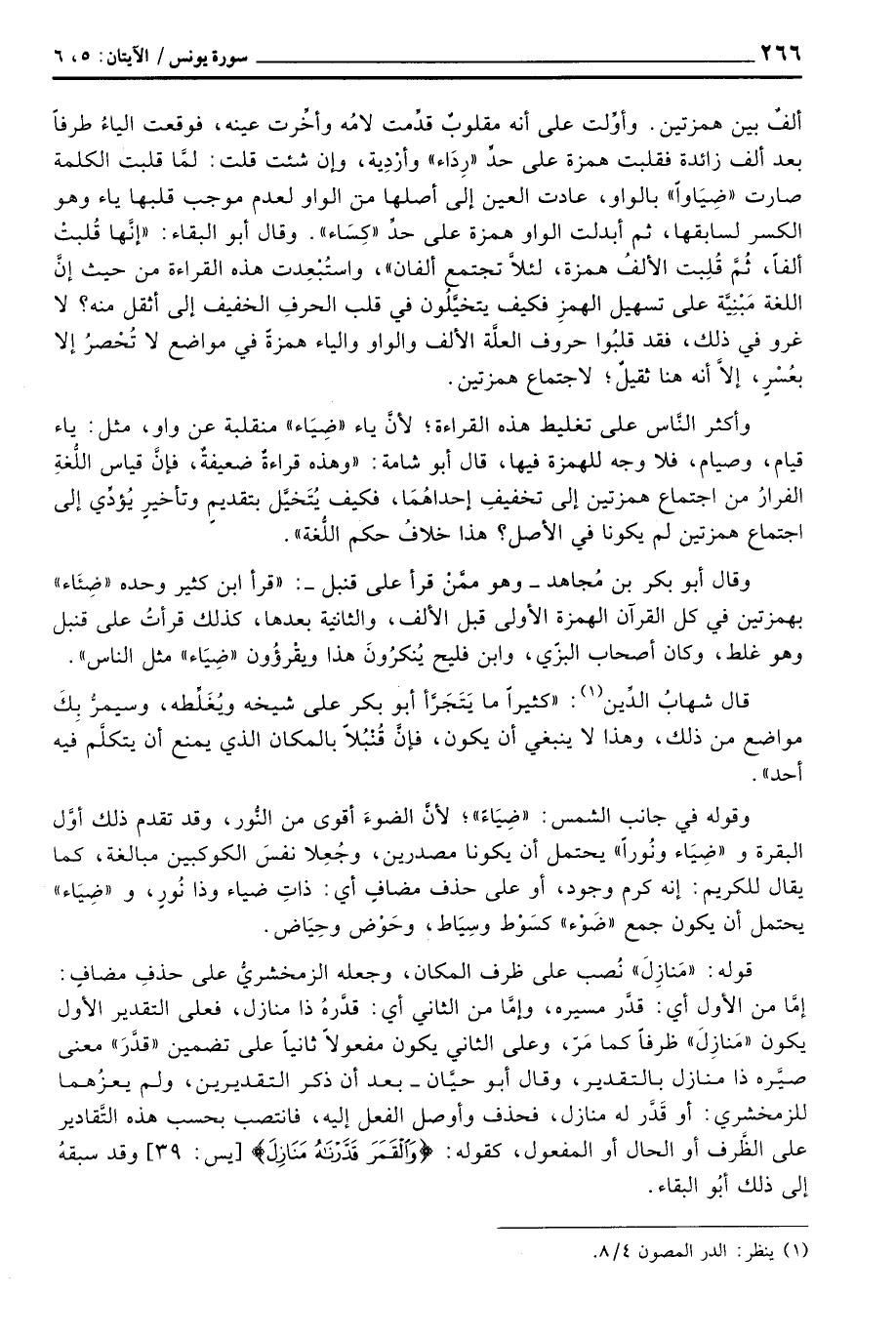 وقوله في جانب الشمس: «ضِيَاءً» ؛ لأنَّ الضوءَ أقوى من النُّور، وقد تقدم ذلك أوَّل البقرة و «ضِيَاء ونُوراً» يحتمل أن يكونا مصدرين، وجُعِلا نفسَ الكوكبين مبالغة، كما يقال للكريم: إنه كرم وجود، أو على حذف مضافٍ أي: ذاتِ ضياء وذا نُورٍ، و «ضِيَاء» يحتمل أن يكون جمع «ضَوْء» كسَوْط وسِيَاط، وحَوْض وحِيَاض.