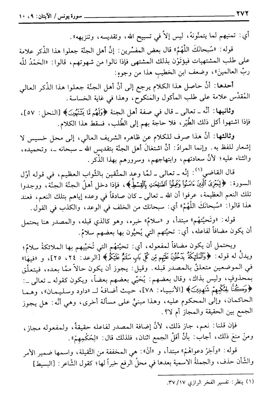 وثالثها: أنَّ هذا صرف للكلام عن ظاهره الشريف العالي، إلى محل خسيس لا إشعار للفظ به. وإنما المرادُ: أنَّ اشتغالَ أهل الجنَّة بتقديس الله - سبحانه -، وتحميده، والثناء عليه؛ لأنَّ سعادتهم، وابتهاجهم، وسرورهم بهذا الذِّكر.
