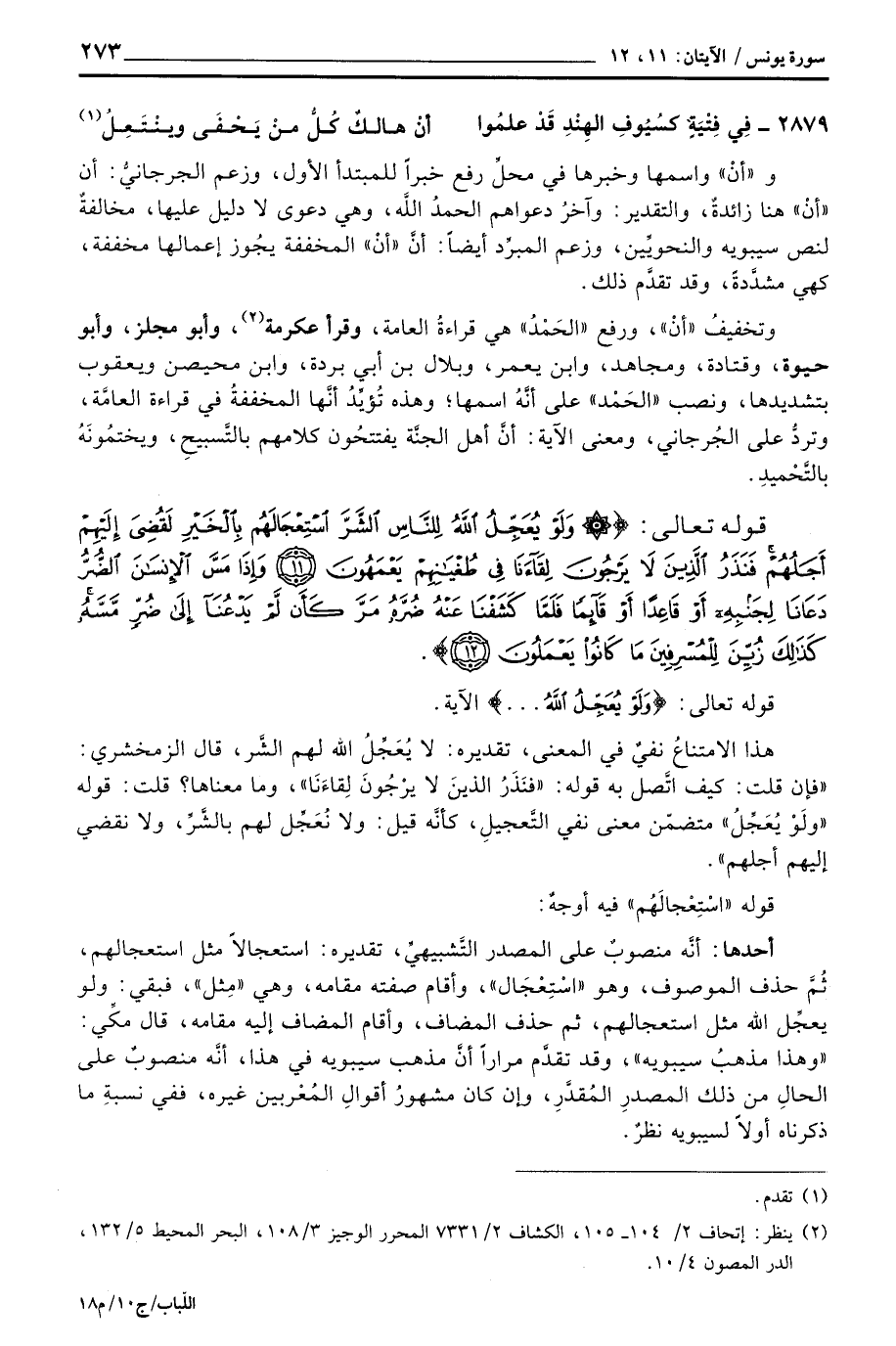 وتخفيفُ «أنْ» ، ورفع «الحَمْدُ» هي قراءةُ العامة، وقرأ عكرمة، وأبو مجلز، وأبو حيوة، وقتادة، ومجاهد، وابن يعمر، وبلال بن أبي بردة، وابن محيصن ويعقوب بتشديدها، ونصب «الحَمْد» على أنَّهُ اسمها؛ وهذه تُؤيِّدُ أنَّها المخففةُ في قراءة العامَّة، وتردُّ على الجُرجاني، ومعنى الآية: أنَّ أهل الجنَّة يفتتحُون كلامهم بالتَّسبيحِ، ويختمُونَهُ بالتَّحْميدِ.