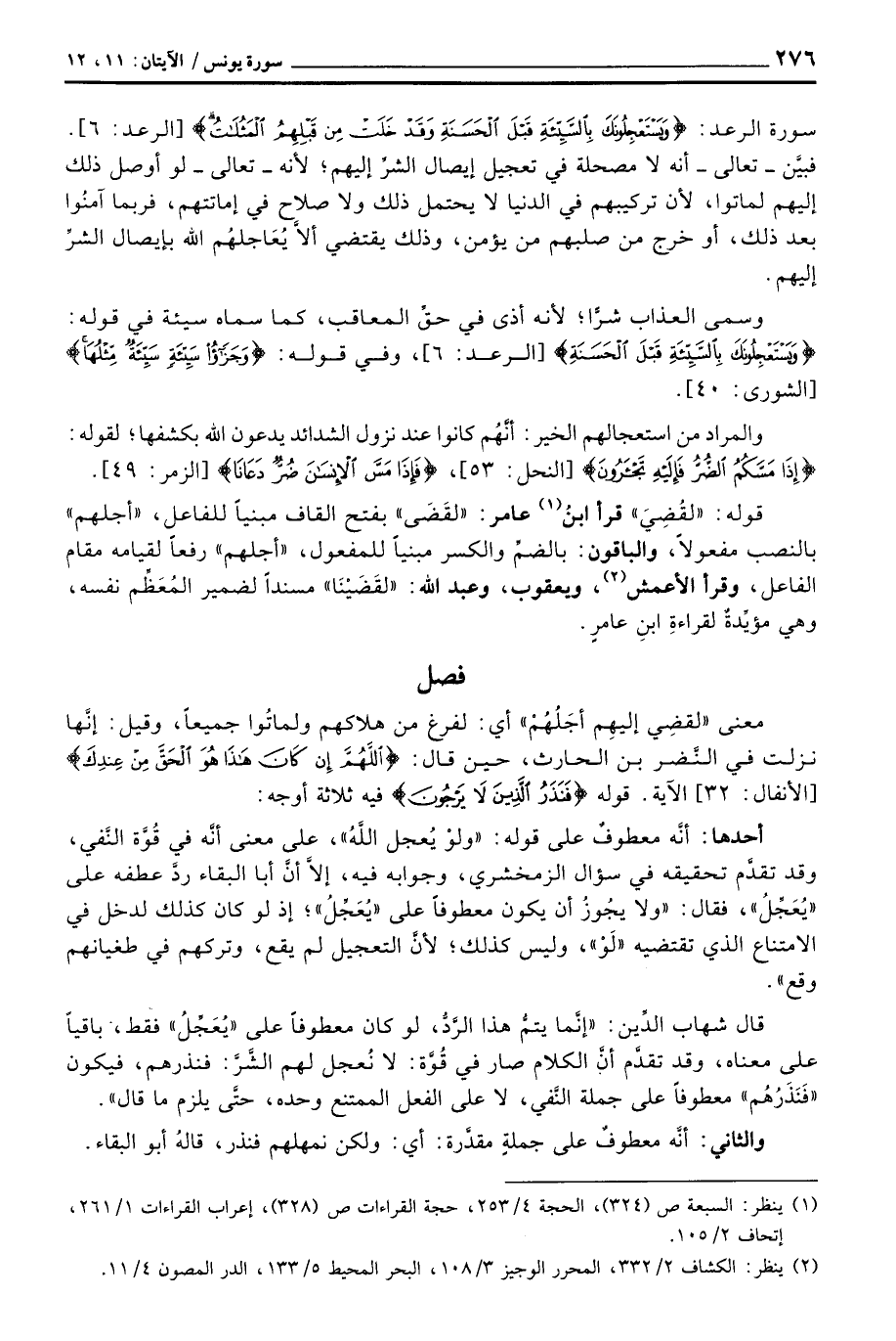 قوله: «لقُضِيَ» قرأ ابنُ عامر: «لقَضَى» بفتح القاف مبنياً للفاعل، «أجلهم» بالنصب مفعولاً، والباقون: بالضمِّ والكسر مبنياً للمفعول، «أجلهم» رفعاً لقيامه مقام الفاعل، وقرأ الأعمش، ويعقوب، وعبد الله: «لقَضَيْنَا» مسنداً لضمير المُعَظِّم نفسه، وهي مؤيِّدةٌ لقراءةِ ابنِ عامرِ.