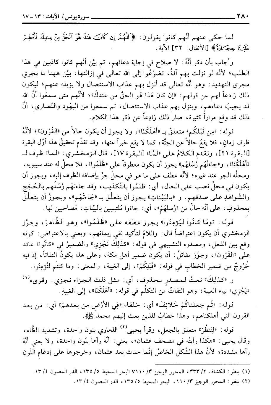 قوله: «مِن قَبْلِكُمْ» متعلقٌ ب «أهْلَكْنَا» ، ولا يجوز أن يكون حالاً من «القُرُون» ؛ لأنَّه ظرف زمانٍ، فلا يقعُ حالاً عن الجثَّة، كما لا يقع خبراً عنها، وقد تقدَّم تحقيقُ هذا أوَّل البقرة [البقرة: 21] ، وتقدم الكلامُ على «لمَّا» [البقرة: 17] ، قال الزمخشري: «لما» ظرف ل «أهْلَكْنَا» ، و «وَجَآءَتْهُمْ رُسُلُهُم» يجوز أن يكون معطوفاً على «ظَلَمُوا» ، فلا محلَّ له عند سيبويه، ومحلُّه الجر عند غيره؛ لأنَّه عطف على ما هو في محلِّ جرِّ بإضافة الظرف إليه، ويجوز أن يكون في محلِّ نصب على الحال، أي: ظلمُوا بالتَّكذيب، وقد جاءتهُم رُسُلُهم بالحُجَجِ والشَّوَاهدِ على صدقهم. و «بالبَيِّنَاتِ» يجوز أن يتعلَّق ب «جَاءتْهُم» ، ويجوزُ أن يتعلَّقَ بمحذوفٍ، على أنَّه حالٌ من «رُسلهُمْ» ، أي: جاءُوا مُلتبسِين بالبيِّناتِ، مُصاحبين لها.