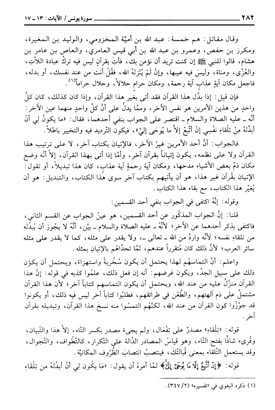 وقال مقاتل: هم خمسة: عبد الله بن أميَّة المخزومي، والوليد بن المغيرة، ومكرز بن حفص، وعمرو بن عبد الله بن أبي قيس العامري، والعاص بن عامر بن هشام، قالوا للنبي صَلَّى اللَّهُ عَلَيْهِ وَسَلَّم َ إن كنت تريد أن نؤمن بك، فأتِ بقرآنٍ ليس فيه تركُ عبادة اللاَّتِ، والعُزَّى، ومناة، وليسَ فيه عيبها، وإنْ لَمْ يُنْزلهُ الله، فقُلْ أنت من عند نفسك، أو بدله، فاجعل مكان آيةٍ عذابٍ آية رحمة، ومكان حرامٍ حلالاً، وحلال حراماً.