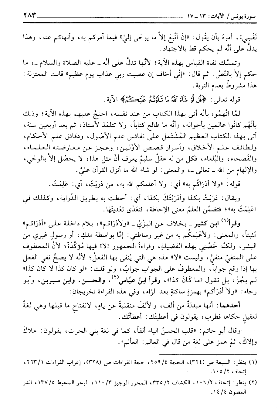 وقرأ ابن كثير - بخلاف عن البزِّيِّ - «ولأدْرَاكم» ، بلام داخلة على «أدْرَاكم» مُثبتاً، والمعنى: ولأعْلِمكُم به من غير وساطتي: إمَّا بواسطة ملكٍ، أو رسولٍ غيري من البشر، ولكنَّه خَصَّنِي بهذه الفضيلةِ، وقراءةُ الجمهور «لا» فيها مُؤكَّدَةٌ؛ لأنَّ المعطوف على المنفيِّ منفيٌّ، وليست «لا» هذه هي التي يُنفى بها الفعلُ؛ لأنَّه لا يصحُّ نفي الفعل بها إذا وقع جواباً، والمعطوفُ على الجواب جوابٌ، ولو قلت: «ول كان كذا لا كان كذا» لم يجُزْ، بل تقول «ما كَانَ كذا» ، وقرأ ابنُ عبَّاس، والحسن، وابن سيرين، وأبو رجاء: «ولاَ أدْرَأكم» بهمزةٍ ساكنةٍ بعد الرَّاء، وفي هذه القراءة تخريجان: