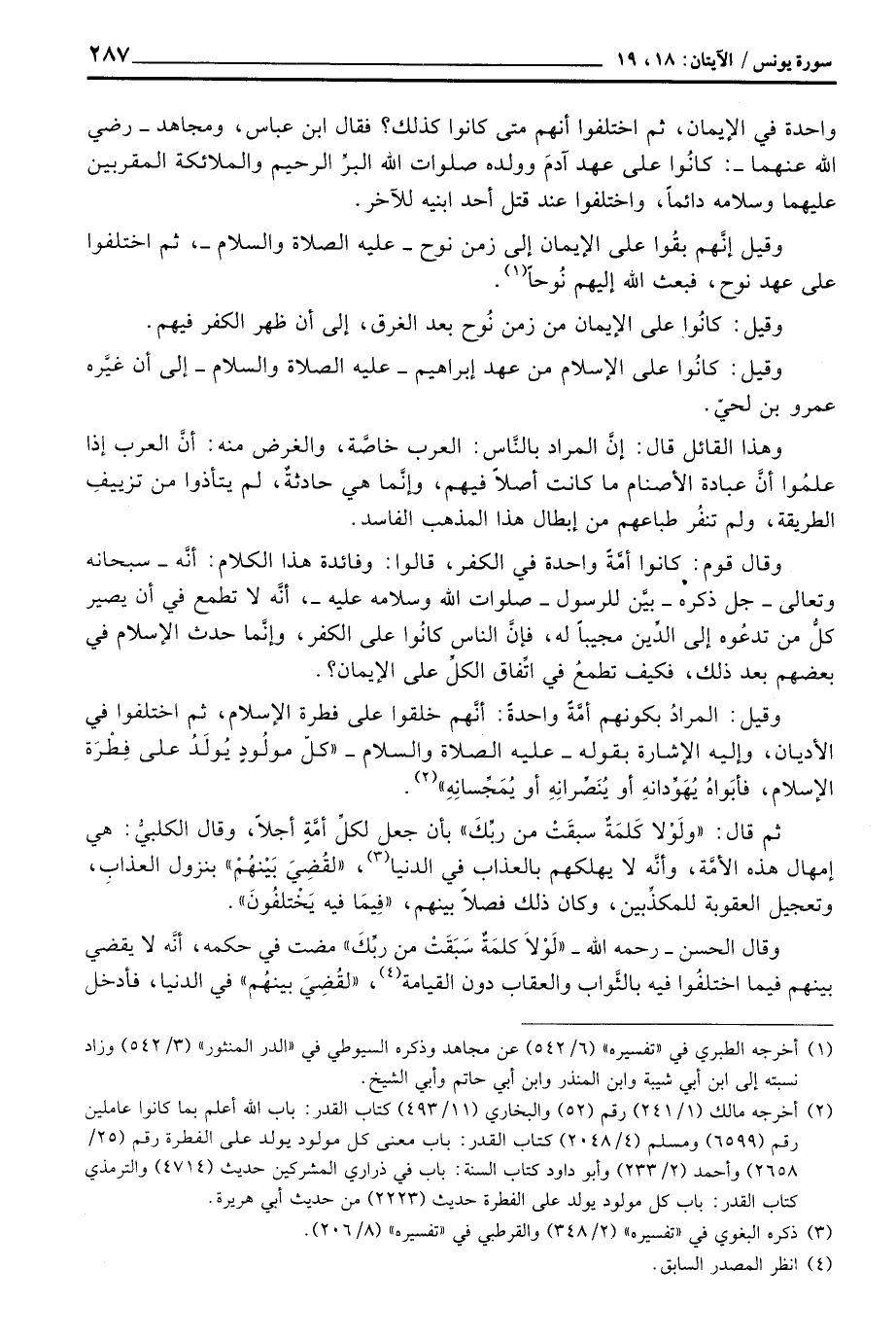 وقيل: المرادُ بكونهم أمَّةً واحدةً: أنَّهم خلقوا على فطرة الإسلام، ثم اختلفوا في الأديان، وإليه الإشارة بقوله - عَلَيْهِ الصَّلَاة وَالسَّلَام ُ - «كلّ مولُودٍ يُولَدُ على فِطْرَةِ الإسلام، فأبَواهُ يُهَوِّدَانهِ أو يُنَصِّرانِهِ أو يُمَجِّسَانِهِ» .